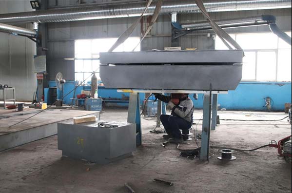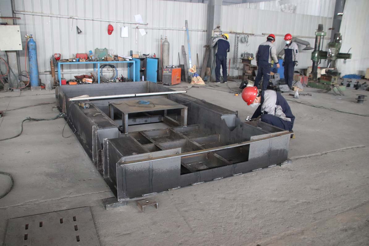 轨道电动平车由台面+框架+传动装置+轮对组+电控设备等组成。平车车架是由槽钢(国标型材)22#及台面钢板Q235-10mm焊接组成。四根纵梁,若干横梁和台面板组成框架结构,车轮材质为ZG45,轴的材料为45#钢,并经过调质处理。