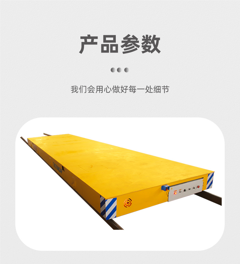 这是一款拖电缆轨道电动平板车,该车长8米、宽2米、高0.35米,采用电缆供电,使用时间不受限制。底盘箱型梁焊接可承重35吨,铸钢车轮结实耐用,平台高度低行走平稳,不易侧翻货物,无线遥控操作简单,速度可人工调节,适合不同场合下使用。声光报警时刻提醒现场人员注意避让,保障作业**。