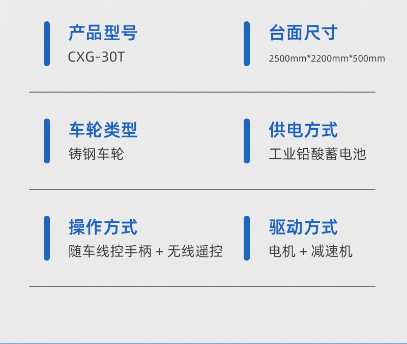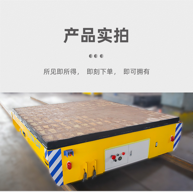 这是一台山东客户定制的蓄电池轨道电动平车,该车长2.5米,宽2.2米,高0.5米,车架箱型梁焊接,结构牢固,载重量大,可载重30吨,应客户使用要求,台面铺设耐火砖;平车采用蓄电池供电,运行距离不受限制,遥控器一键操作,可启动停止、前进后退、调速等,设有双限位开关,可根据现场设定地点自动停靠,前后光电检测,遇障自停,声光报警保障**,能够在垂直轨道、L型轨道、S型轨道、弧形轨道及易爆、摆渡场合使用。
