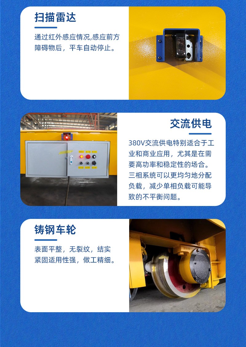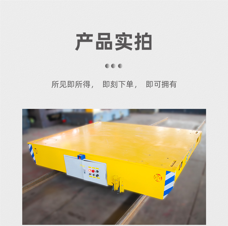 拖电缆电动轨道平板车,电缆供电作业时间不受限制,铸钢车轮结实寿命长,平台高度低行走平稳,不易侧翻货物,低速大功率运行,启动平稳驱动力大,适用于各种工况。设有双组限位传感器,可根据现场设定地点自动停靠,同时可定制升降,称重、远程调度、车载机械、异形卡槽、滚轮台面、超低台面等功能。