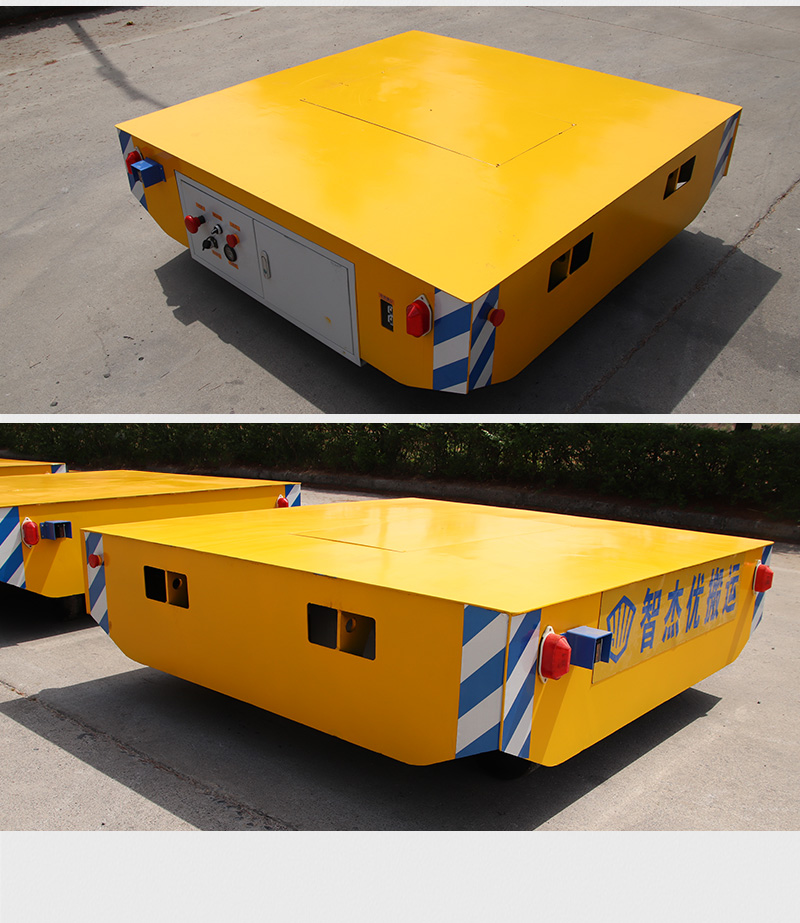 无轨电动平车,车身长1.5米。宽1.5米,高0.5米,箱梁结构焊接,结构稳定,蓄电池供电,运行路线不受限制。无线遥控小车,可前进后退左右转弯,原地旋转,采用卧式驱动轮和万向轮,转向灵活,电磁制动。断电自动刹车,车身对角设有急停按钮、声光报警、保障**,激光雷达遇障自停。