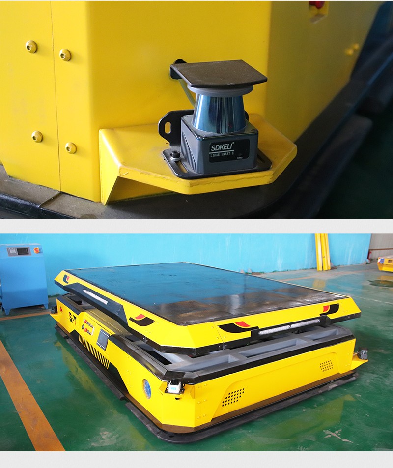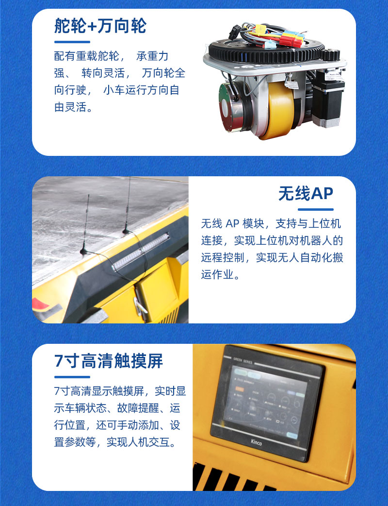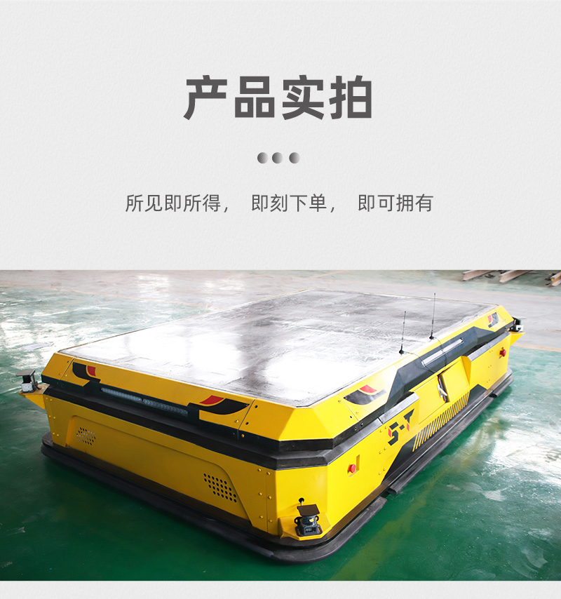 这是一台AGV自动化搬运机器人,整车长3米宽2米高0.6米,载重5吨,框架结构钣金造型,外形美观大方。AGV搬运机器人采用激光导航及二维码两种导航方式,设有无线AP模块,上位机控制小车前进、后退、左右转向,纵横移动,原地旋转,米字行走。对角安装2组重载舵轮,2组双回旋万向轮,小车搭载液压装置,平台可上下升降,行程15厘米,同时还具有自动调平功能,预防货物倾斜滑落,装有导航雷达、激光雷达,循迹行走自动避障,同时设有声光报警、智能语音播报,提醒人员注意避让。