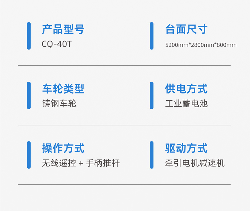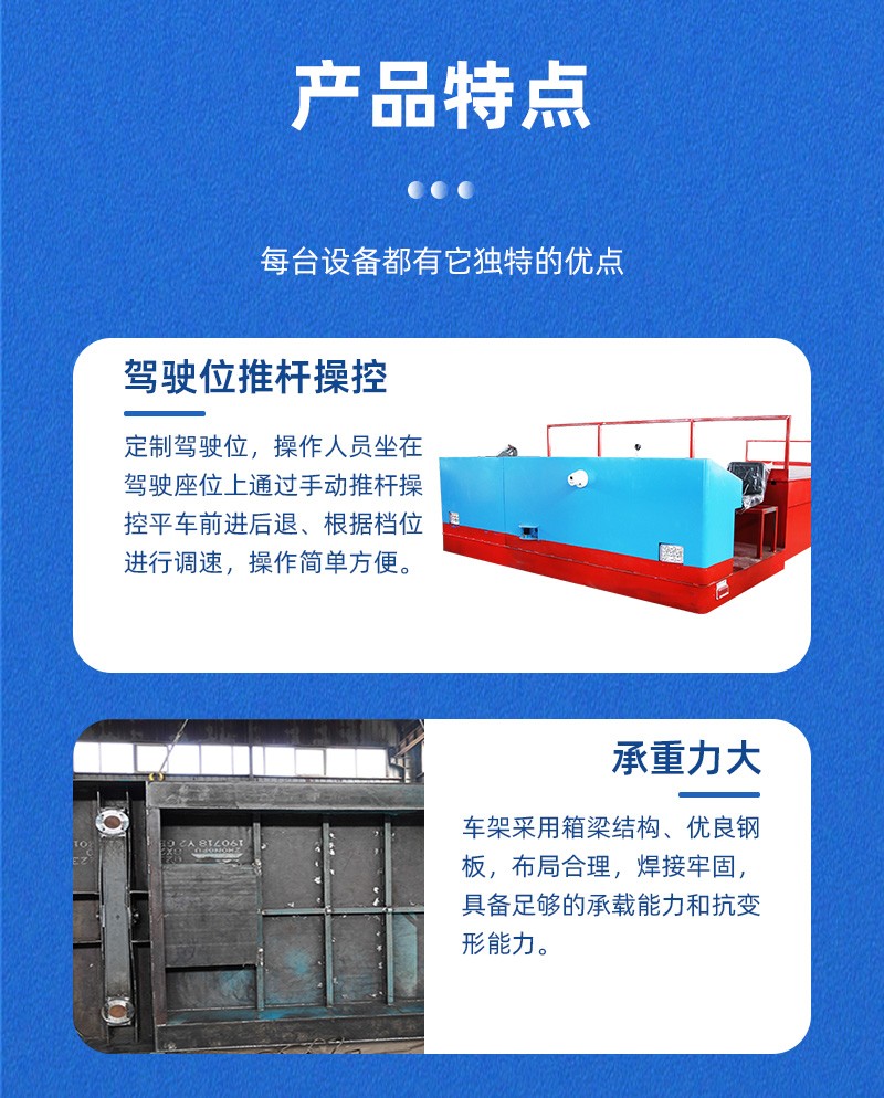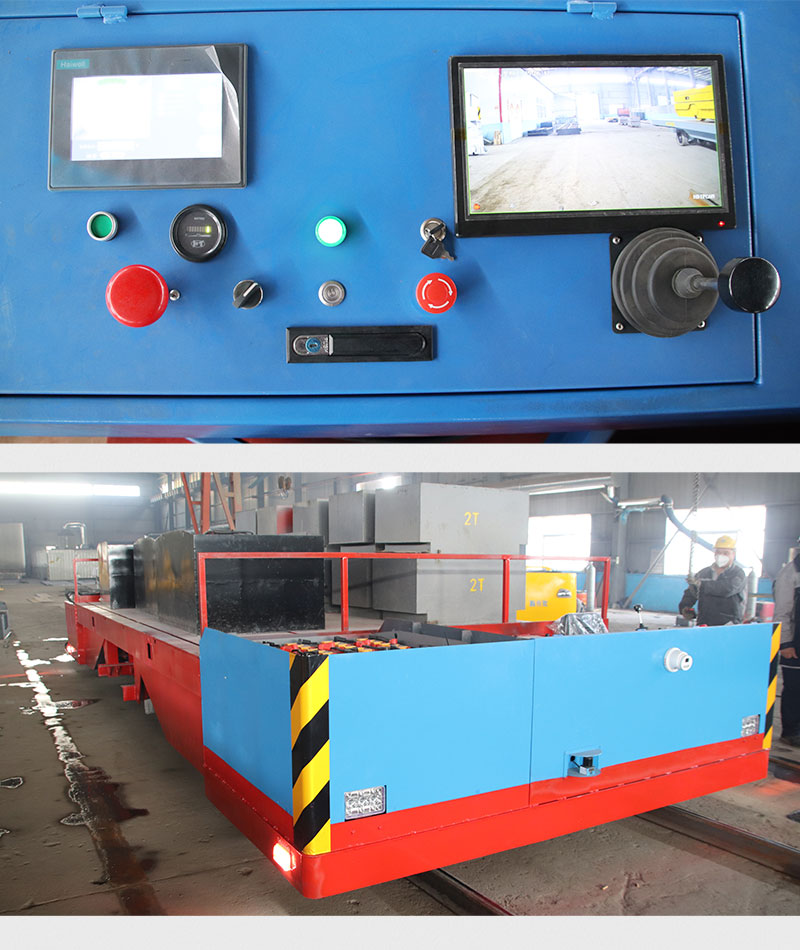 轨道牵引电动平车,该车即可为无动力车辆提供牵引动力,自身也可搬运重物使用,整车长5.2米宽2.8米高0.8米载重40吨,平车前端设有驾驶位,可人工驾驶推杆操控平车前进后退。加减速,也可远距离无线遥控作业,平车配备PLC显示屏,实时显示车辆状态信息,同时配备前置射影像视屏,实时显示前方路况实况,避免碰撞,示廓灯、摄像头、激光雷达270度自动扫描避障,确保平车运行**,平车后方设有牵引装置,满足牵引作业需求。