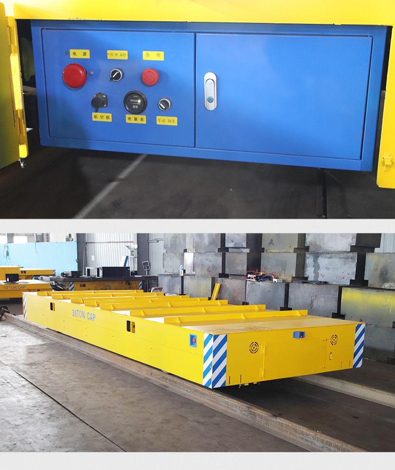 喷砂房轨道搬运车电动平板转运车,长6米宽2米高0.6米载重30吨,客户用于喷砂房物料的转运工作,蓄电池供电运行时间3小时,双组大功率电机大扭矩减速机驱动力足传动效率高,电气箱、电池组、电机均定制防尘罩,防尘防水防油污,无线遥控控制平车前进后退、运行速度可调节,前后设有双组行程开关,到达指定地点缓慢减速停车,前后光电检测,遇到障碍物自动停车,距离可调0.5-1.5米,声光报警同步工作。