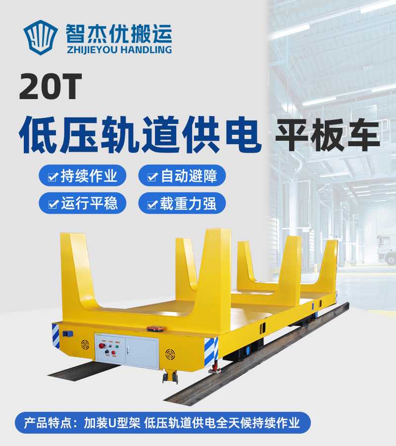 维修简单低压轨道供电式电动平车,整车长6米宽2米高0.5米载重20吨,箱梁结构钢板焊接结构牢固载重量大不易变形,台面加装U型架,用于圆柱体物料的转运作业,采用低压轨道供电方式,36V**电压大大降低触电风险,通过取电滑块装置取电无需拖缆运行,不受电池续航能力的限制,可满足全天候不间断作业,平车可以灵活的随轨道拐弯,可直线运行,也可环形行驶,运行距离不受限制,主被动轮均为绝缘车轮避免短路,人工无线遥控操作简单方便。
