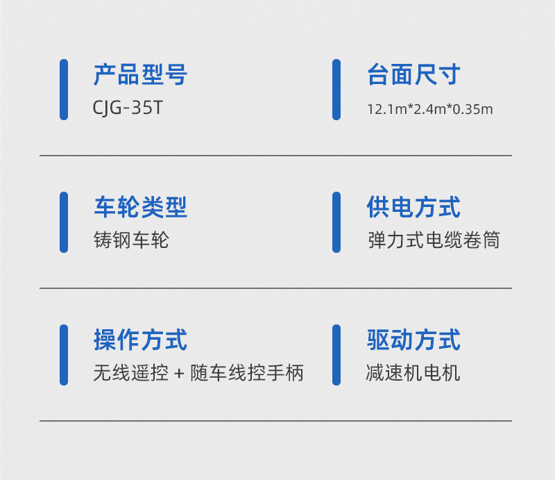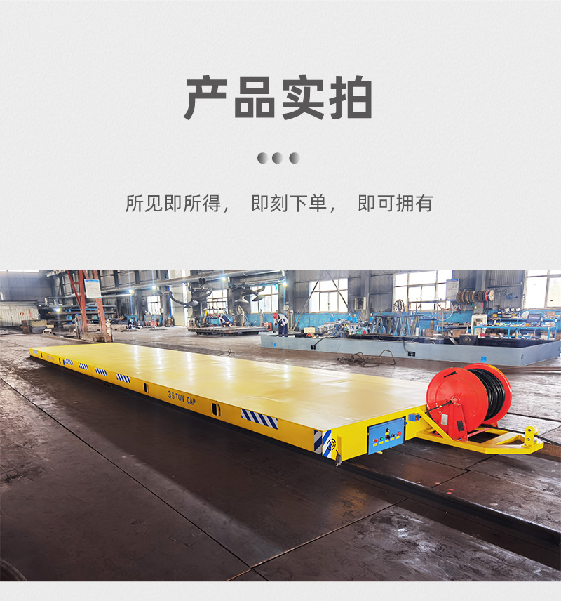 智杰优搬运研发制造的重载轨道搬运车,长12米宽2.4米高0.35米额定载重35吨,主要用于机电设备的运输过跨,采用电缆卷筒供电方式,卷筒自动收放电缆线不易损伤电缆,增加使用寿命,并且适用于远距离的频繁搬运需求,无线遥控操作平车前进后退、运行速度0-20m/min速度可调节,超低台面方便设备的装卸,**装置设有光电检测,遇到障碍自动停车,声光报警、急停开关,**性高,电缆卷筒轨道搬运车的运用,解决了企业重型设备过跨难的问题,同时提高生产装配效率,减少人工劳动降本增效!