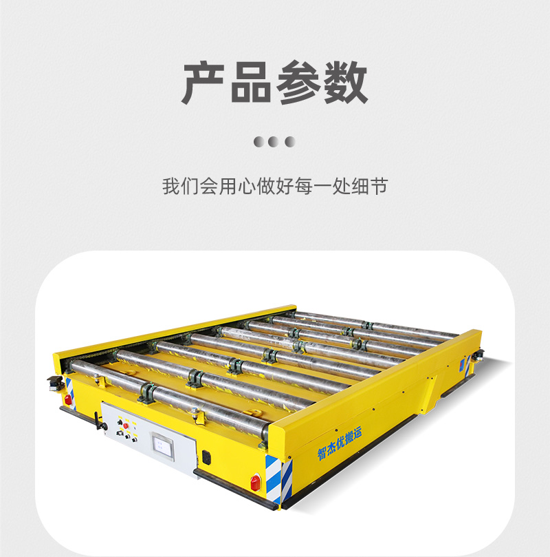 智杰优搬运为自动化生产线设备输送研发制造的重载AGV自动化搬运车,长3米宽3.2米高0.7米额定载重10吨,主要用于运输设备进行自动化生产线对接作业,采用先进的激光导航技术,通过激光扫描器识别反射板确保移动平台能在复杂环境中精确定位,提高生产线对接的精确度,台面定制辊筒装置,根据程序设定可自主完成物料的装卸和传送,无需人工干预,采用PLC控制系统,运行路线设有5个停靠点,停车精度高可达正负10mm,设有无线通讯可连接甲方系统总控控制进行远程操控,锂电池供电续航里程长,智能充电桩自动充电,除自动化运行模式外支持无线遥控作业,轮系采用聚氨酯包胶轮搭配万向轮,可全向运行,差速转向灵活稳定,**装置设有避障雷达、声光报警、防撞触边、急停开关等保护,AGV自动化搬运车的运用与现有的输送线无缝对接,形成一个完整的自动化工作流,减少物料在生产线中的停滞时间,提升整体生产效率!