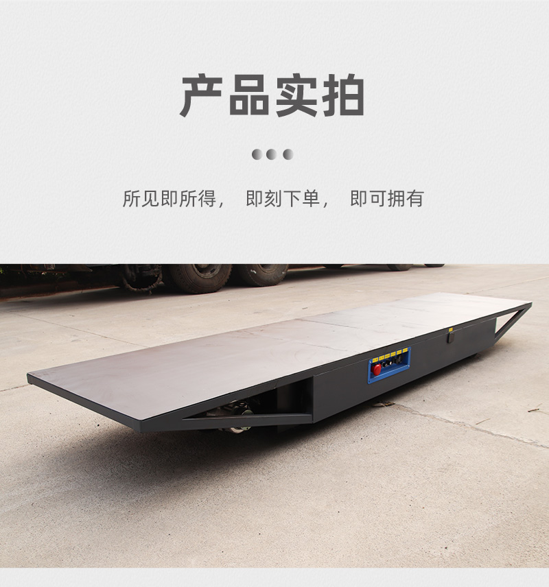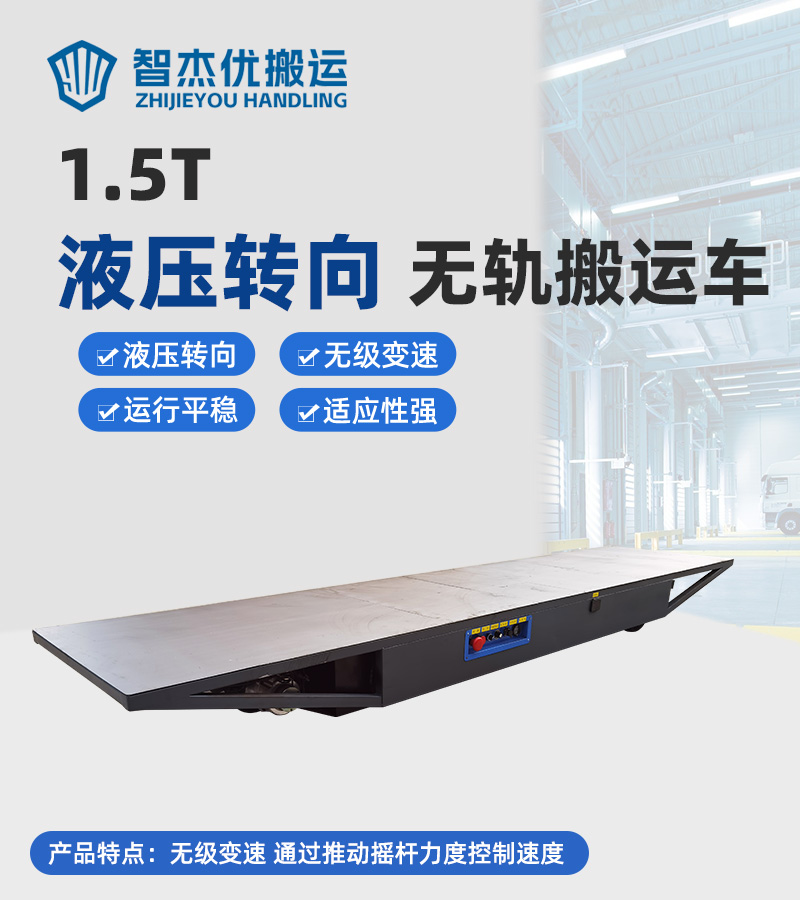 液压转向无轨搬运车,整车长4米宽0.9米高0.3米额定载重1.5吨,该车作为大型演出中移动舞台之用,采用蓄电池供电,满载运行不低于2小时,无线遥控操作简单方便,运行速度为1米每秒,无极调速通过拨动摇杆力度大小控制行车速度,采用液压转向,阻力小转向灵活,转向过后车轮具有自动回正功能,轮系配备实心橡胶轮防滑耐磨耐刺穿,适应多种路面运行,满足户外使用要求,可在50mm深水中运行,**可靠性能稳定。电磁刹车制动响应灵敏,**装置设有急停开关、声光报警等保护,确保行车**。
