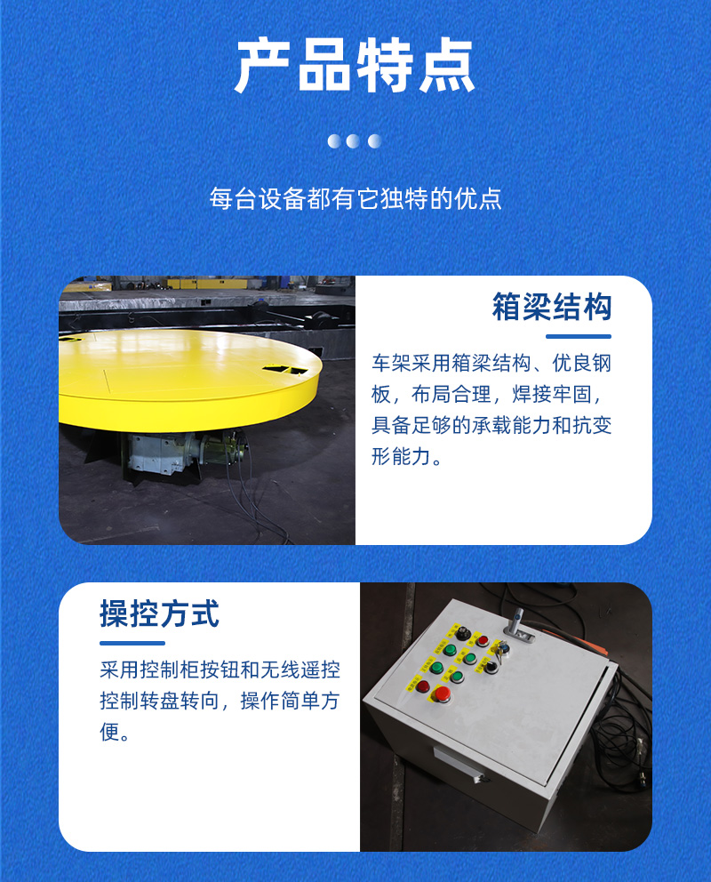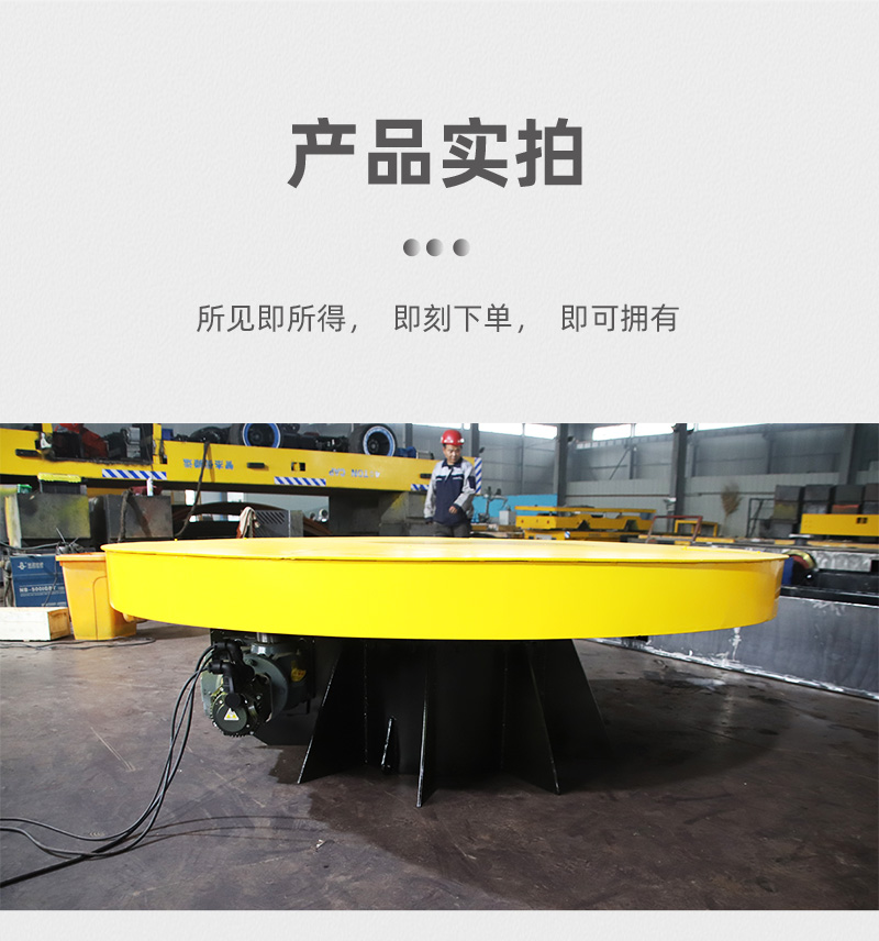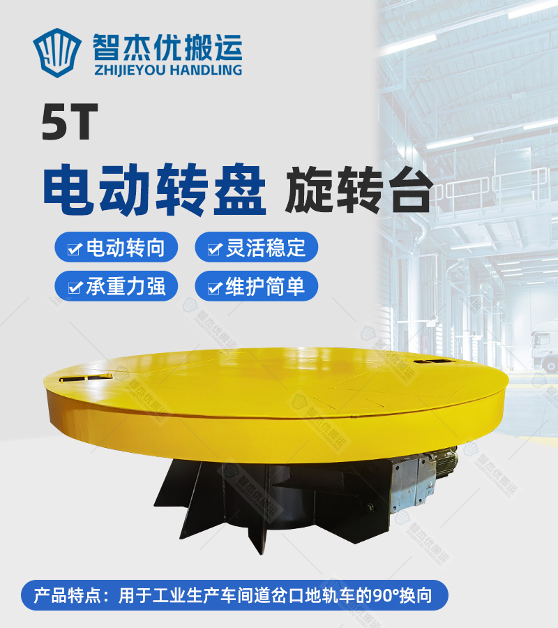 智杰优搬运生产制造的工业重载电动转盘平车换向旋转台,转盘直径2米高1.3米额定载重5吨,主要用于工业生产车间道岔口地轨车的90°换向,采用控制柜按钮操作,简单方便。380v交流电供电可满足随时使用需求,电动转向转弯灵活稳定承重力强,一般安装于基础底坑内,转盘与地面齐平,轨道对接精准,方便上方地轨车进行换向行驶,该系列电动转盘可根据实际需求进行定制双轨道、十字交叉轨道,也可平台台面用于大型机械装备的装配等使用。