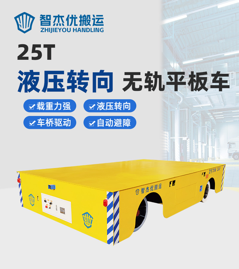 无轨电动平板车模具转运车出厂前运行测试实拍,长4米宽2.4米高0.8米额定载重25吨,客户主要用于模具的跨车间转运作业,锂电池供电续航里程长充电时间短,无线遥控操作前进后退左转右转,液压转向灵活轻便容易维护,采用电机车桥驱动,性能稳定可靠,高扭矩输出传动效率高驱动力足,车桥驱动系统通过性好,负载力强,即使在摩擦力较大的路面也能**运行,室外运行具备一定爬坡能力,聚氨酯包胶车轮防滑耐磨弹性好适用性强,前后安装光电检测遇到障碍自动停车,声光报警急停开关**性高