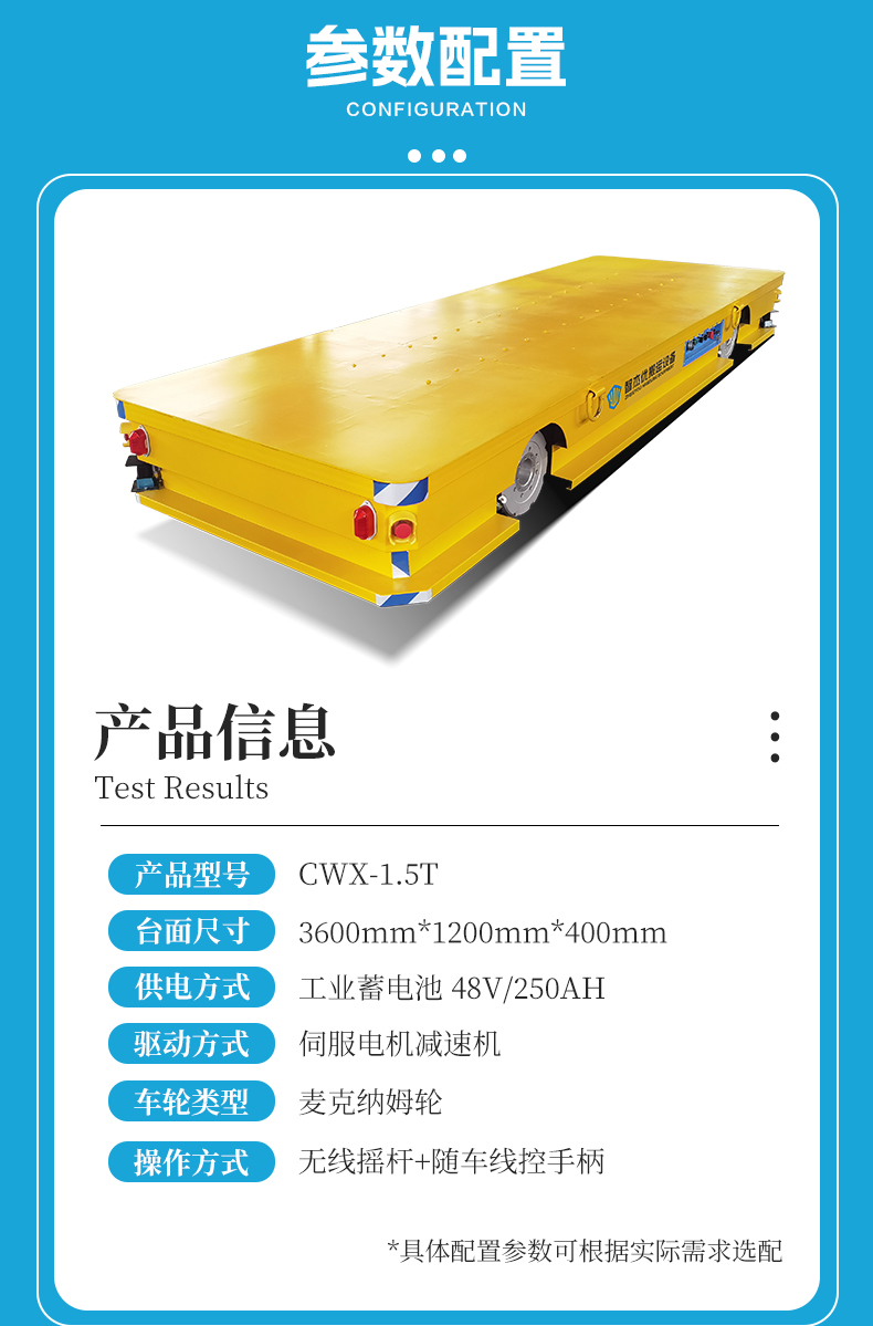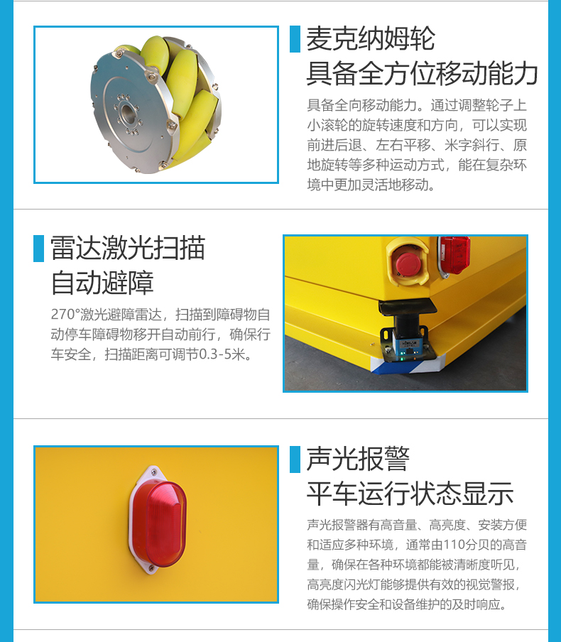 智杰优搬运生产制造的麦克纳姆轮全向无轨地平车,长3.6米宽1.2米高0.4米额定载重1.5吨,客户用于搭载检测设备对产品进行检测使用。伺服电机驱动实现精确的位置、速度和转矩控制,无线摇杆操作简单,麦克纳姆轮支持原地旋转、左右横移、米字斜行、前进后退,可在狭窄作业环境下精准到达指定位置,蓄电池供电容量大配备智能充电机电流平稳,电磁制动响应灵敏,270度避障激光雷达,扫描到障碍物自动停车,障碍物移开自动前进,声光报警急停开关**性高,同时具有欠压、过压、过流、过载、低电量提醒等平车保护。
