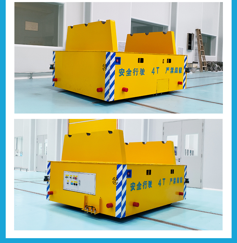 智杰优搬运制造的纵横移动轨道车,整车长2米宽1.8米高0.75米额定载重4吨,客户用于铜箔卷的跨车间运输作业。车架箱梁结构结实耐用,台面铺设2mm304花纹钢板,两侧装有辊轴支架,用于放置铜箔卷。配备8只铸钢车轮可进行上下升降变轨实现轨道车纵横移动,根据轨道铺设路线十字交叉运行,进行跨车间的物料运输,定位传感器限位开关控制轨道车停车精度,提前减速缓慢停车精准换轨自动运行。
