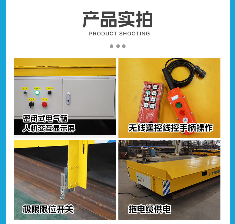 20吨拖电缆轨道搬运车,整车长5米宽2米高0.5米额定载重20吨,客户主要用于钢结构的搬运。车架箱梁结构,优质钢板焊接耐摔耐砸结实耐用,采用拖电缆供电24小时连续作业,无线遥控控制平车前进后退操作简单便捷,车尾加装挡板方便货物放置,电机减速机驱动平车运行驱动力足,电磁制动断电自动刹车。前后设置极限限位开关,触碰设置铁块自动停车防止轨道车冲出轨道确保**运输,具有欠压、过压、过流、短路等防护!