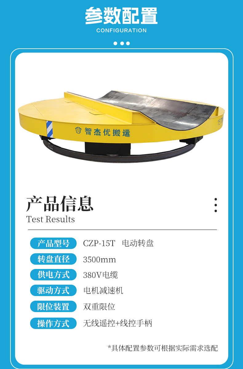 维修简单直径3.5米载重15吨的电动转盘旋转台,客户用于直径1.5米长10米复合材料卷的原地掉头作业,平台上方设置椭圆形凹槽方便物料放置,上方铺设10cm厚橡胶防滑垫,防止在旋转过程中物料晃动避免划伤物料,通过设置限位开关双重限位,旋转到180度自动先减速再缓慢停车,无线遥控控制转盘正反转操作简单方便,采用电机减速机驱动,启动平稳缓慢无冲击,380V电缆线供电不受蓄电池容量限制,可全天候连续作业,旋转速度可调节,设有高中低三个档位,电磁制动断电自动刹车,声光报警时刻提醒工作人员注意避让**性高,结构稳定维护简单,电动转盘的运用,帮助客户解决长物料掉头难的问题节省人力提升效率,智杰优搬运专注各种类型搬运设备非标定制,咨询我获取同款车型报价!