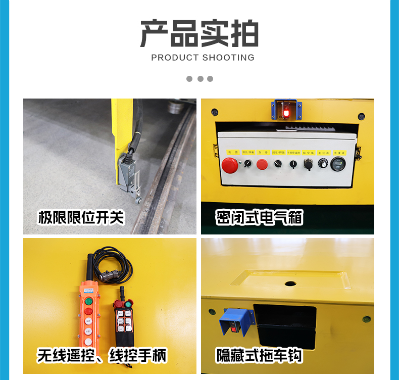 长5米宽2.5米高0.55米箱梁结构优质钢板焊接承重力强,轻松应对重型钢材、机械设备等大件物料转运,电机减速机动力输出平顺强劲,侧面预留接口可进行双车联动,一个遥控器控制两台车同时运行,适合超长工件的跨车间搬运。大容量蓄电池供电续航时间长无需频繁充电,该车设有隐藏式拖车钩,通过释放刹车可当做平板拖车进行使用,大大提高了轨道车的使用灵活性,电机、电池等核心部件均采用密封防护工艺,从容应对户外雨雪、粉尘等恶劣环境,搭载红外传感器超声波测距避障系统,实时探测轨道前方障碍物,遇到障碍自动停车,模块化设计,电池部件支持快速拆换,**大限度减少停机损失!