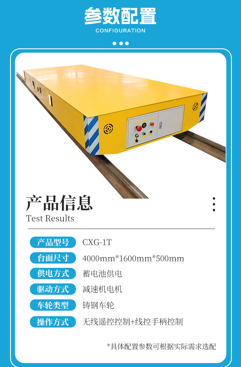 整车长4米宽1.6米高0.5米额定载重1吨,客户用于生产线零部件的转运。高强钢车架箱梁结构稳定牢固承重力强,工业蓄电池供电可根据运行时间定制电池容量,轨道运行稳定可靠。高硬度铸钢车轮耐磨损寿命长,支持遥控/手柄多模式操控,灵活适配生产需求。配备声光报警、断电保护、紧急制动、光电检测,全面守护作业**。轨道式电动平车多种供电方式可供选择,蓄电池、滑触线、低压轨道、电缆卷筒。