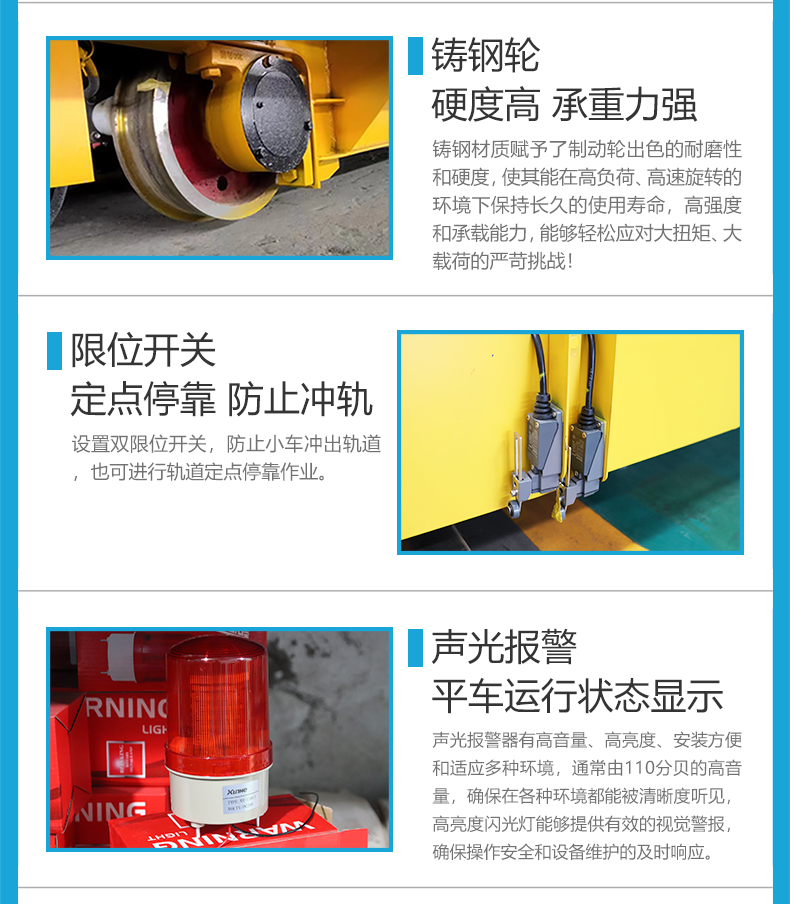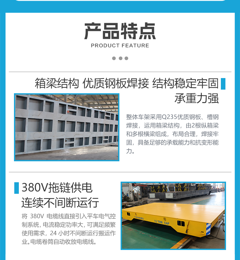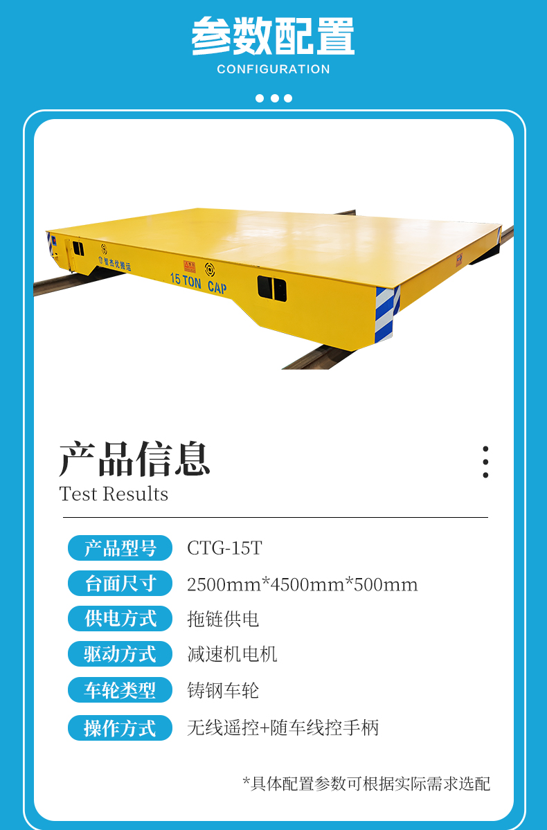 短距离重物过跨转运车拖链供电轨道平车,长2.5米宽4.5米平台设计,0.5米低**设计,车架高强钢焊接箱梁结构稳定牢固,可承载15吨的货物,电机减速机驱动系统,动力输出稳定强劲,启停平稳无冲击,采用拖链供电系统支持来回往复运行,告别传统电缆磨损难题,可满足全天候搬运作业需求,无续航焦虑,轻松应对设备零部件、钢材、设备半成品等重型物料,光电避障、极限限位、过载保护多重**防护,打造全天候**作业环境,轻松应对高频次、长周期作业场景!