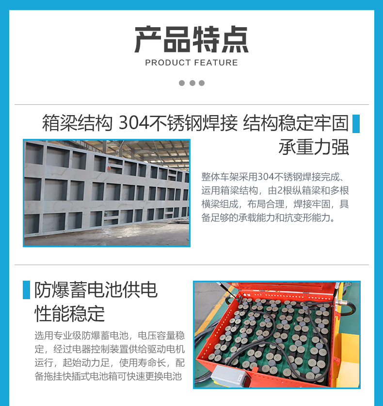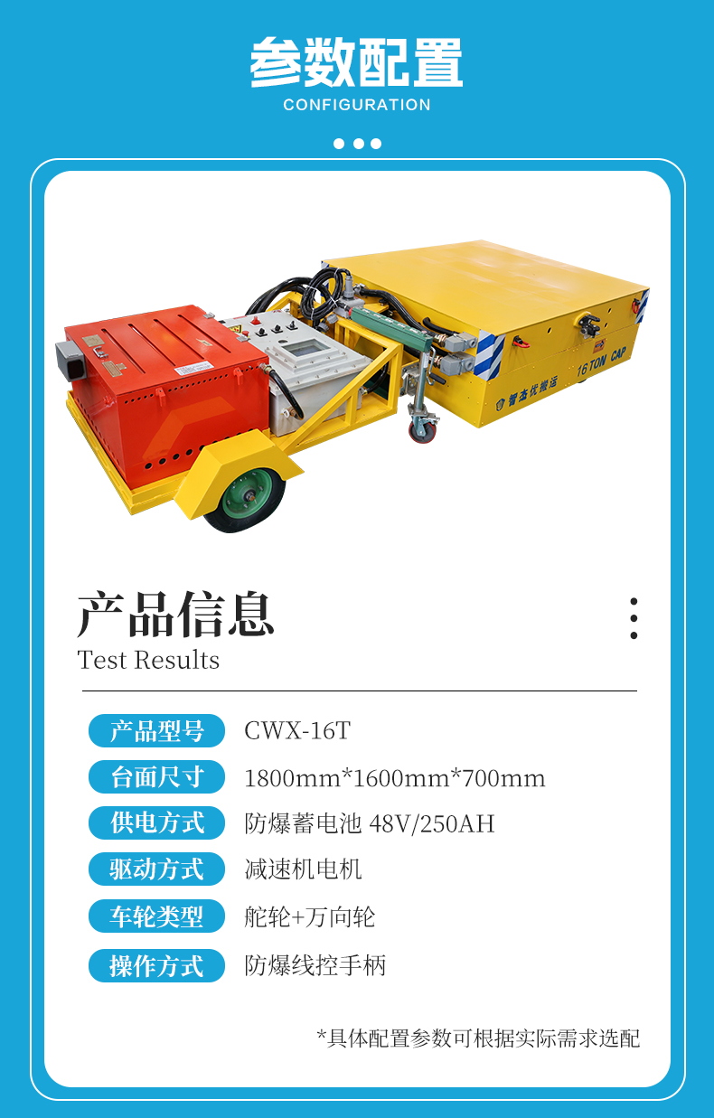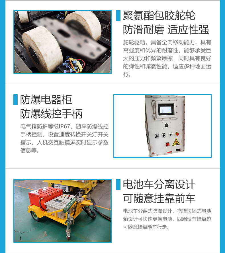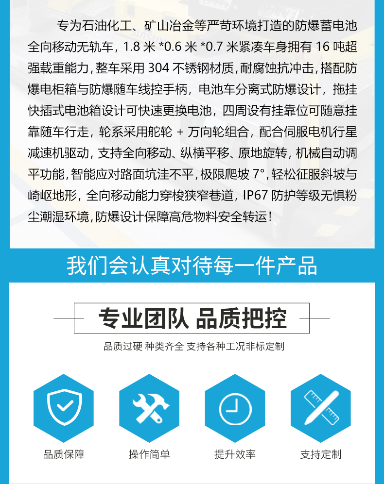 专为石油化工、矿山冶金等严苛环境打造的防爆蓄电池全向移动无轨车,1.8米*0.6米*0.7米紧凑车身拥有16吨超强载重能力,整车采用304不锈钢材质,耐腐蚀抗冲击,搭配防爆电柜箱与防爆随车线控手柄,电池车分离式防爆设计,拖挂快插式电池箱设计可快速更换电池,四周设有挂靠位可随意挂靠随车行走,轮系采用舵轮+万向轮组合,配合伺服电机行星减速机驱动,支持全向移动、纵横平移、原地旋转,机械自动调平功能,智能应对路面坑洼不平,极限爬坡7°,轻松征服斜坡与崎岖地形,全向移动能力穿梭狭窄巷道,IP67防护等级无惧粉尘潮湿环境,防爆设计保障高危物料**转运!