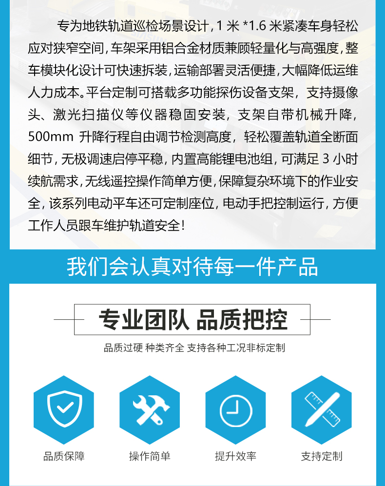 专为地铁轨道巡检场景设计,1米*1.6米紧凑车身轻松应对狭窄空间,车架采用铝合金材质兼顾轻量化与高强度,整车模块化设计可快速拆装,运输部署灵活便捷,大幅降低运维人力成本。平台定制可搭载多功能探伤设备支架,支持摄像头、激光扫描仪等仪器稳固安装,支架自带机械升降,500mm升降行程自由调节检测高度,轻松覆盖轨道全断面细节,无极调速启停平稳,内置高能锂电池组,可满足3小时续航需求,无线遥控操作简单方便,