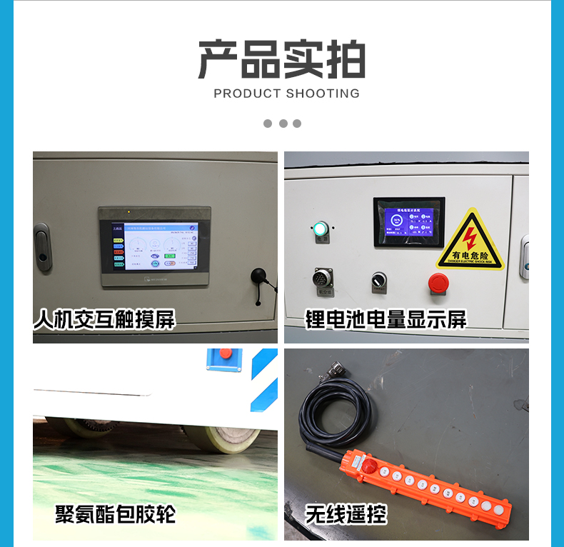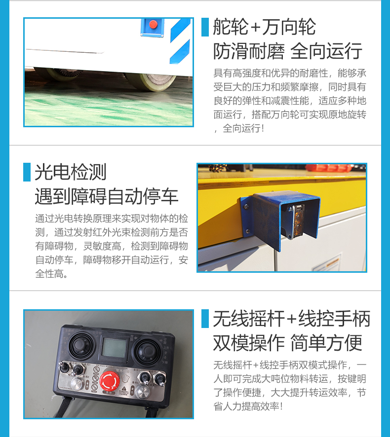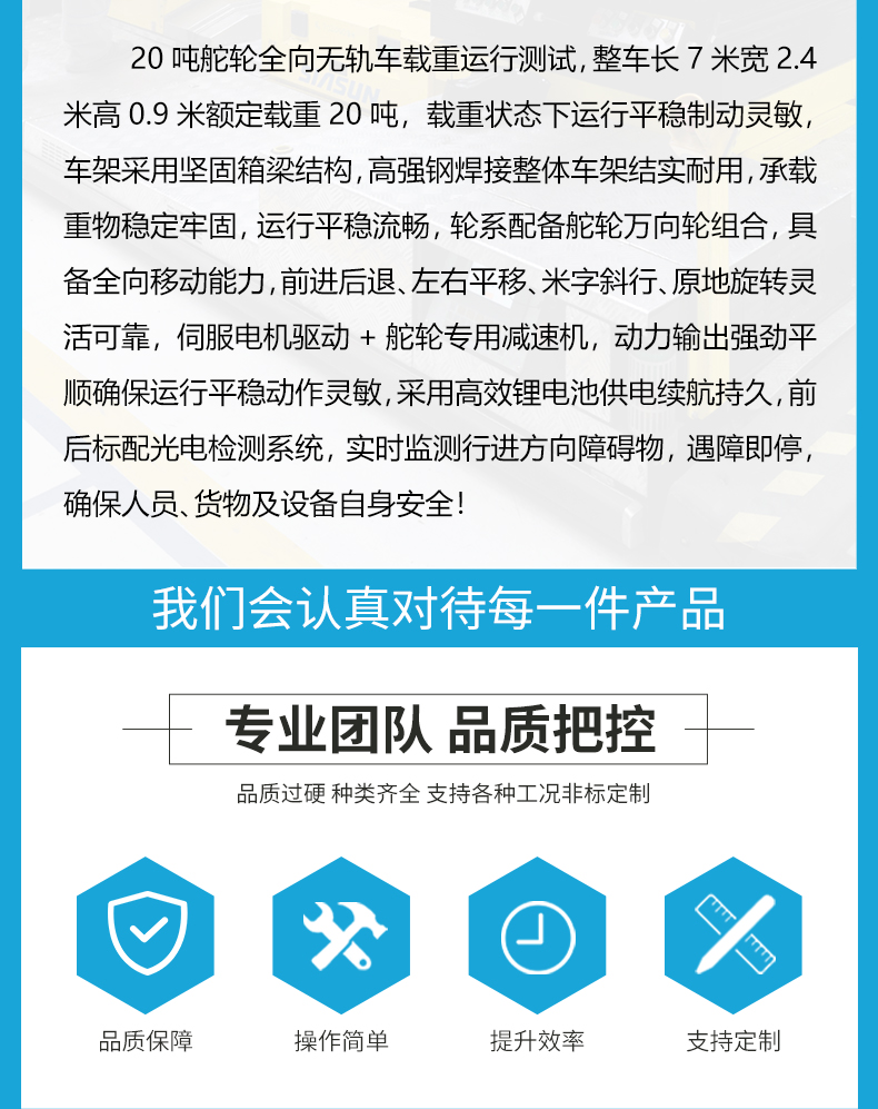 20吨全向移动无轨平板车,7米*2.4米宽大平台0.9米定制高度,高强钢焊接稳定牢固轻松承载重型设备、大型模具,轮系配备2个高性能聚氨酯包胶舵轮+2个万向轮组合,配合精密伺服电机减速机驱动动力澎湃输出稳定,集前进后退、左右转弯、纵横移动、米字斜行、原地旋转于一身,聚氨酯材质耐磨静音不伤地面。无线摇杆+有线手柄两种操作模式简单方便上手快,光电检测系统实时扫描障碍物,遇障自动停车确保货物人员**。