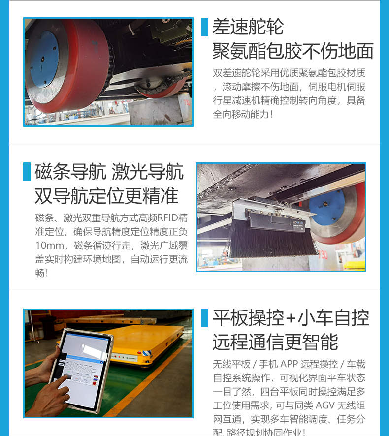 磁条+激光导航AGV,6米*2.8米*0.5米定制化车身轻松承载20吨额定载荷。磁条、激光双重导航方式高频RFID精准定位,确保导航精度定位精度正负10mm,四组高性能差速舵轮搭载伺服电机行星减速机,具备全向移动能力,前进后退、左右平移、原地旋转,聚氨酯包胶材质不伤地面。具备3度爬坡能力。无线平板/手机APP远程操控/车载自控系统操作,可视化界面平车状态一目了然,四台平板同时操控满足多工位使用需求,可与同类AGV无线组网互通,实现多车智能调度、任务分配、路径规划协同作业,打造无人化物料搬运。大容量锂电池供电满载运行不低于5小时,智能充电机具备1.5小时极速补电,大度提升设备利用率告别续航焦虑,车身四周灵敏防撞触边,遇阻即停,醒目声光报警时时提醒运行状态 ,全方位环境感知雷达自动避障,保障AGV**高效进行搬运任务!