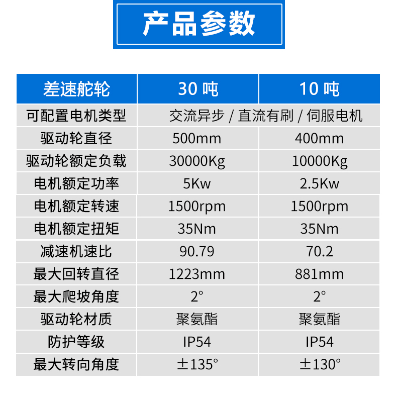 AGV重载舵轮是专为高负载自动化场景设计的驱动单元,集驱动、转向和承载功能于一体,适用于高负荷、高精度要求的工业环境,智杰优自主研发生产的30吨重载双差速舵轮,集成升降、称重等功能于一身,无需额外举升模块,节省空间与成本,双驱动轮通过齿轮传动实现差速驱动,滚动摩擦的旋转方式,降低阻力不伤地面,提升地面适应性。适配专用控制器实现精准转向与速度控制,配置编码器实时监测转向角度,提升控制精度,可驱动AGV车辆进行前进、横移、斜行、原地旋转等运动控制,满足工业重载自动化搬运需求!