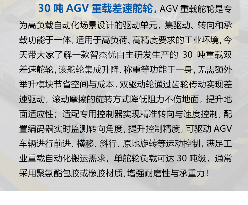AGV重载舵轮是专为高负载自动化场景设计的驱动单元,集驱动、转向和承载功能于一体,适用于高负荷、高精度要求的工业环境,智杰优自主研发生产的30吨重载双差速舵轮,集成升降、称重等功能于一身,无需额外举升模块,节省空间与成本,双驱动轮通过齿轮传动实现差速驱动,滚动摩擦的旋转方式,降低阻力不伤地面,提升地面适应性。适配专用控制器实现精准转向与速度控制,配置编码器实时监测转向角度,提升控制精度,可驱动AGV车辆进行前进、横移、斜行、原地旋转等运动控制,满足工业重载自动化搬运需求!