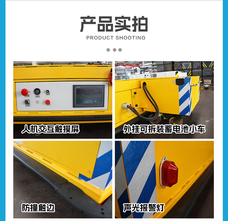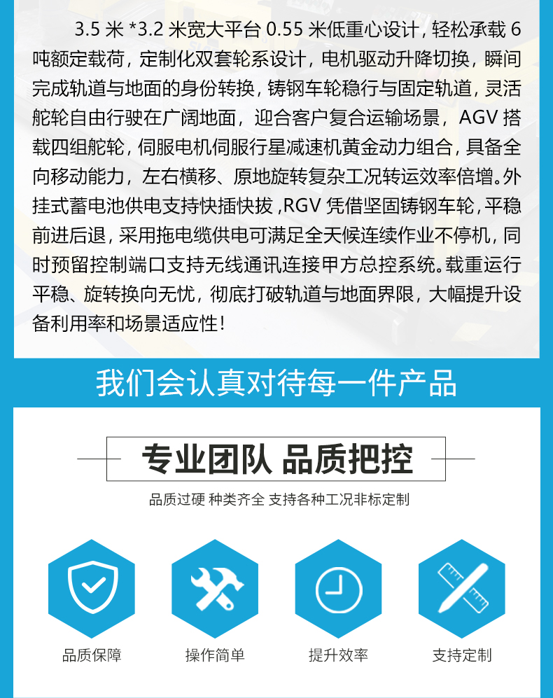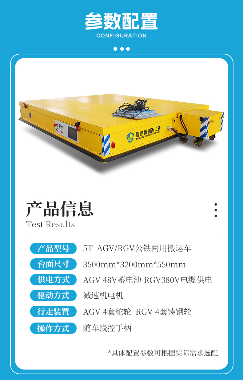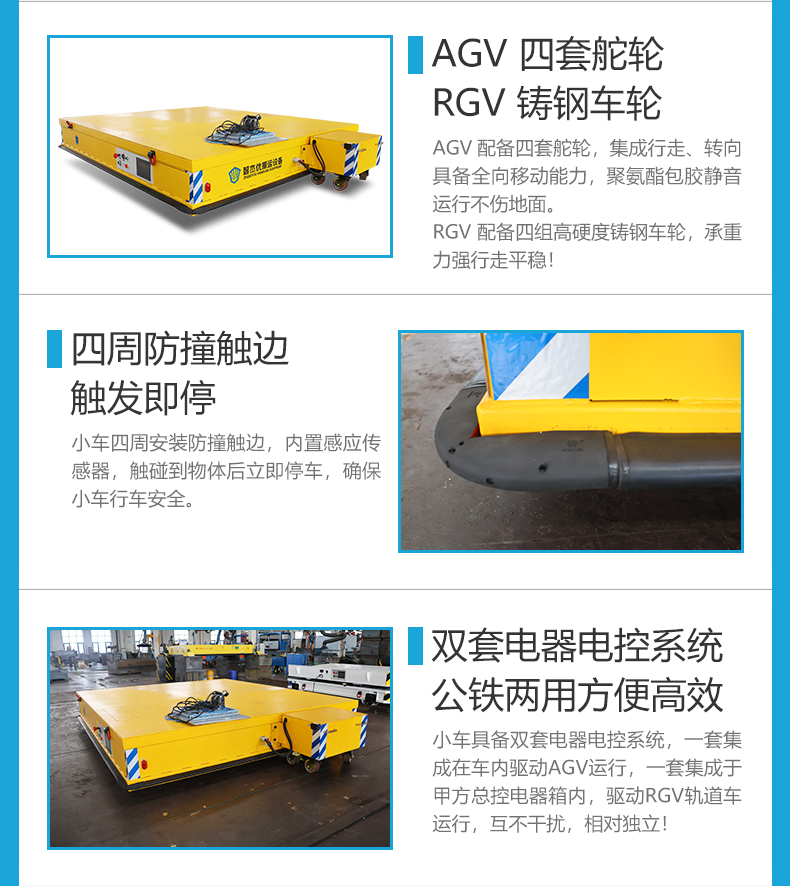 AGV/RGV公铁两用电动平板搬运车,一车双用,打破场景限制! 3.5米*3.2米宽大平台0.55米低**设计6吨级额定载荷,柔性生产线物料自由配送与跨区域重型部件轨道转运一车搞定。平车集成双套电控系统,AGV控制系统集成在车内,RGV控制系统集成于甲方控制柜,预留端口支持外部通讯可由甲方总控远程控制RGV轨道车运行。小车配备8套行走装置,AGV模式下4套高性能聚氨酯包胶舵轮,支持360度全向移动能力静音运行不伤地面,RGV模式下4组高强度铸钢车轮承载力强运行平稳,转换开关一键上下升降完成换轨,轻松跨越公铁轨道界限,AGV采用可拆卸独立蓄电池小车供电作业自由无拘束,RGV采用拖电缆供电满足全天候连续作业不停机,车身四周配备机械防撞触边遇障即停,为人员、设备及货物构筑全方位**屏障,一车两用助力企业**搬运降本增效!