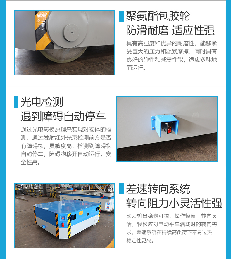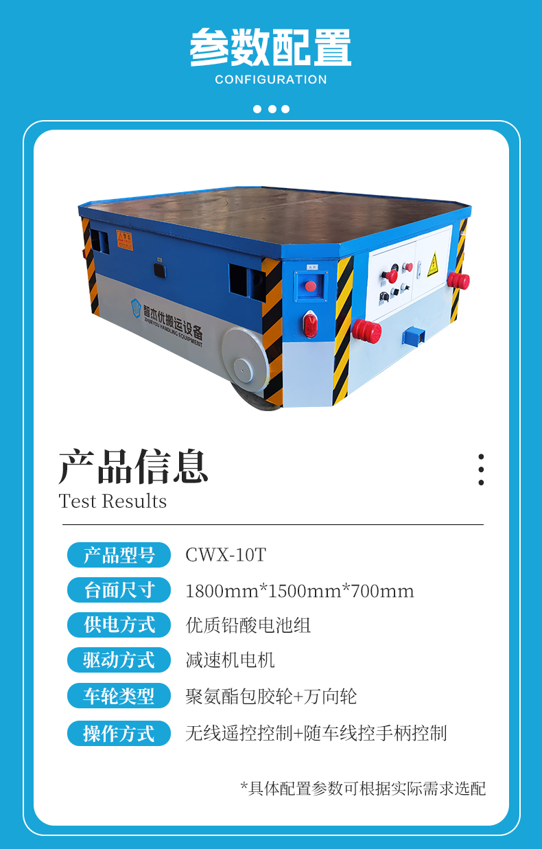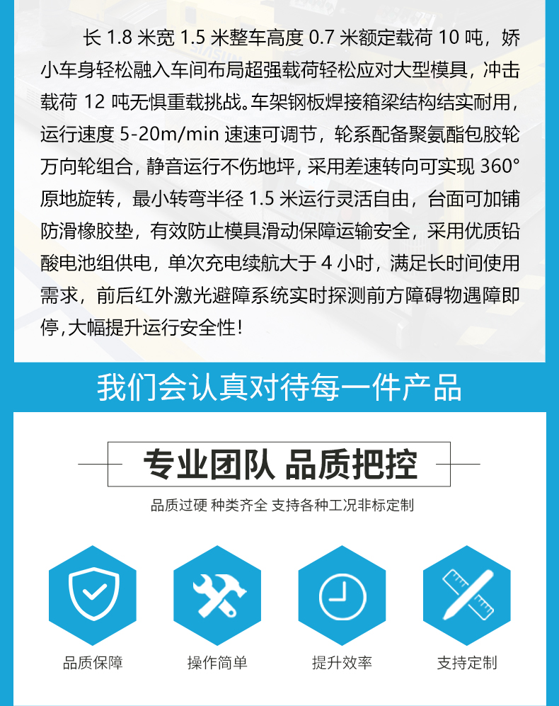 专为汽车零部件生产车间模具转运定制的差速转向无轨车,长1.8米宽1.5米整车高度0.7米额定载荷10吨,娇小车身轻松融入车间布局超强载荷轻松应对大型模具,冲击载荷12吨无惧重载挑战。车架钢板焊接箱梁结构结实耐用,运行速度5-20m/min速速可调节,轮系配备聚氨酯包胶轮万向轮组合,静音运行不伤地坪,采用差速转向可实现360°原地旋转,**小转弯半径1.5米运行灵活自由,台面可加铺防滑橡胶垫,有效防止模具滑动保障运输**,采用优质铅酸电池组供电,单次充电续航大于4小时,满足长时间使用需求,前后红外激光避障系统实时探测前方障碍物遇障即停,大幅提升运行**性!