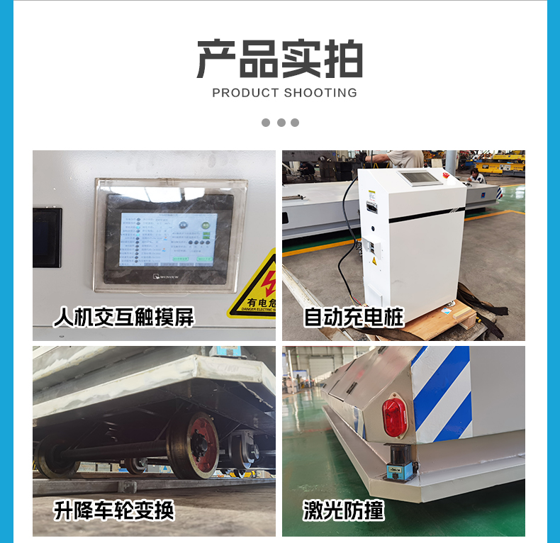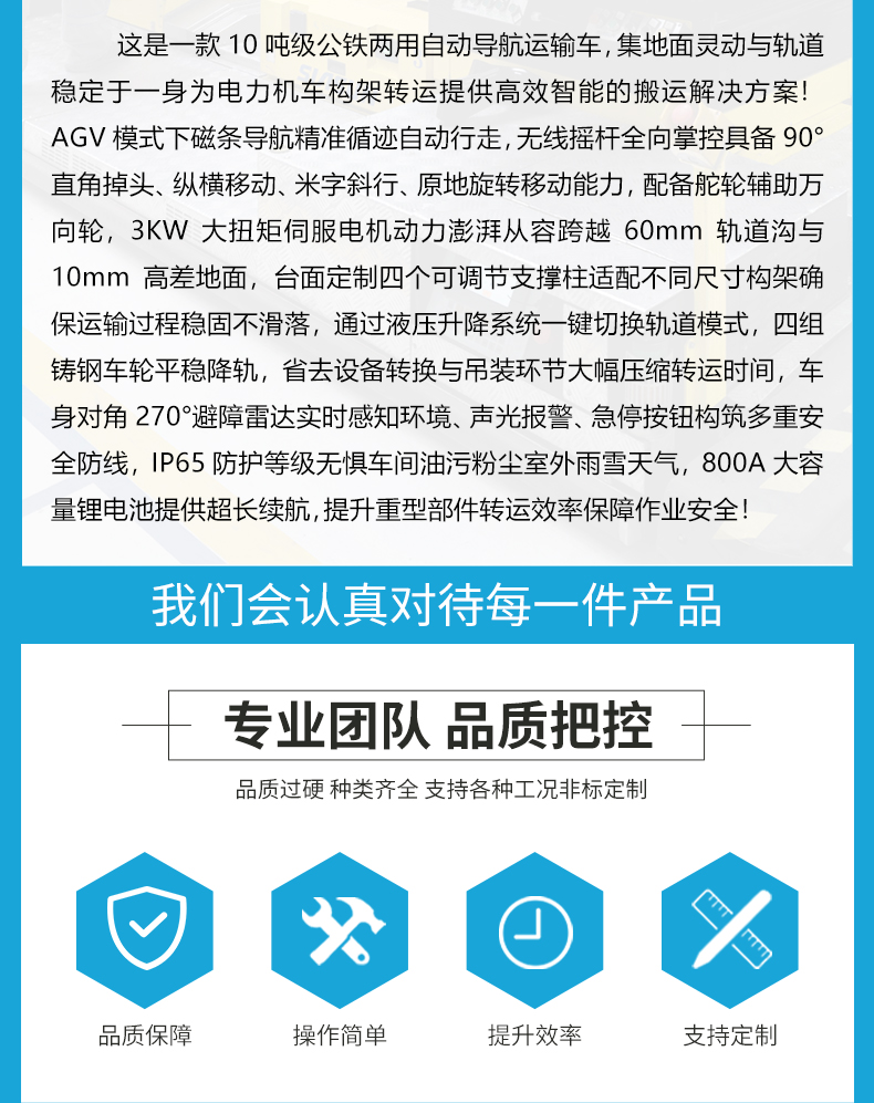 既能在地面上全向移动又能瞬时切换**轨道稳定运行的搬运车你见过吗?这是一款10吨级公铁两用自动导航运输车,集地面灵动与轨道稳定于一身为电力机车构架转运提供高效智能的搬运解决方案!AGV模式下磁条导航精准循迹自动行走,无线摇杆全向掌控具备90°直角掉头、纵横移动、米字斜行、原地旋转移动能力,配备舵轮辅助万向轮,3KW大扭矩伺服电机动力澎湃从容跨越60mm轨道沟与10mm高差地面,台面定制四个可调节支撑柱适配不同尺寸构架确保运输过程稳固不滑落,通过液压升降系统一键切换轨道模式,四组铸钢车轮平稳降轨,省去设备转换与吊装环节大幅压缩转运时间,车身对角270°避障雷达实时感知环境、声光报警、急停按钮构筑多重**防线,IP65防护等级无惧车间油污粉尘室外雨雪天气,800A大容量锂电池提供超长续航,提升重型部件转运效率保障作业**!