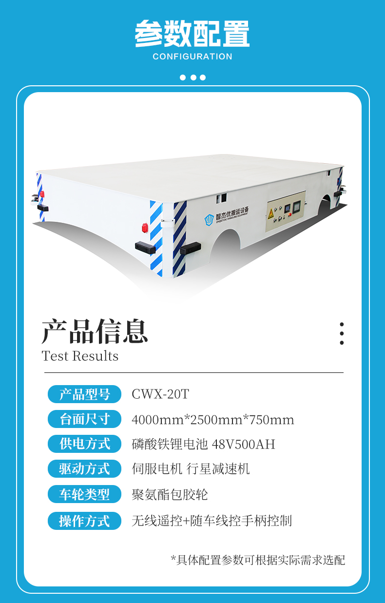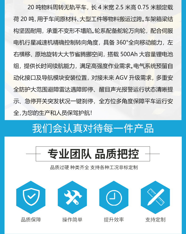 20吨物料周转无轨平车,长4米宽2.5米高0.75米额定载荷20吨,用于车间原材料、大型工件等物料搬运过跨。车架箱梁结构坚固耐用,承重不变形不塌陷。轮系配备舵轮万向轮,配合伺服电机行星减速机精确控制转向角度,具备360°全向移动能力,左右横移、原地旋转大大节省腾挪空间,搭载500Ah大容量锂电池组,提供长时间续航能力,满足高强度作业需求。电气系统预留自动化接口及导航模块安装位置,对接未来AGV升级需求,多重**防护大范围避障雷达遇障即停、醒目声光报警运行状态清晰提示、急停开关突发状况一键刹停,全方位多角度保障平车运行**,为您的生产和人员保驾护航!