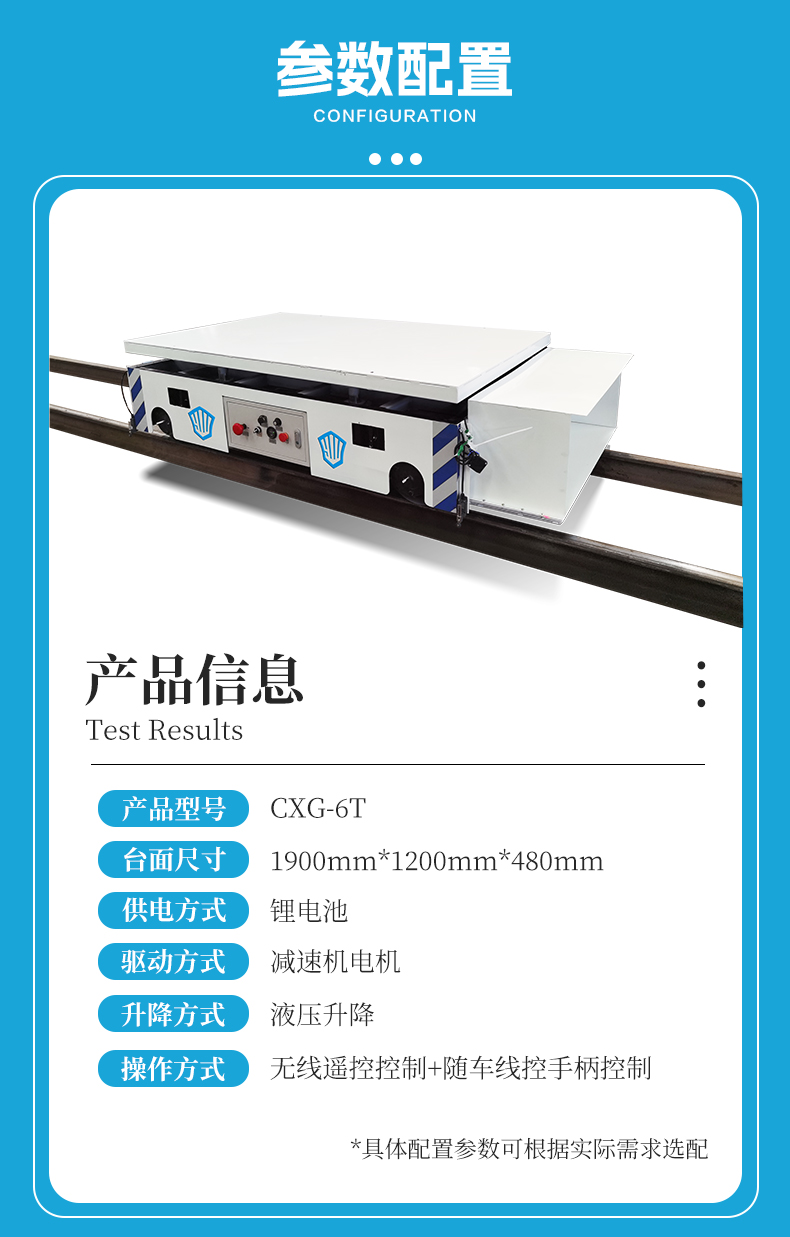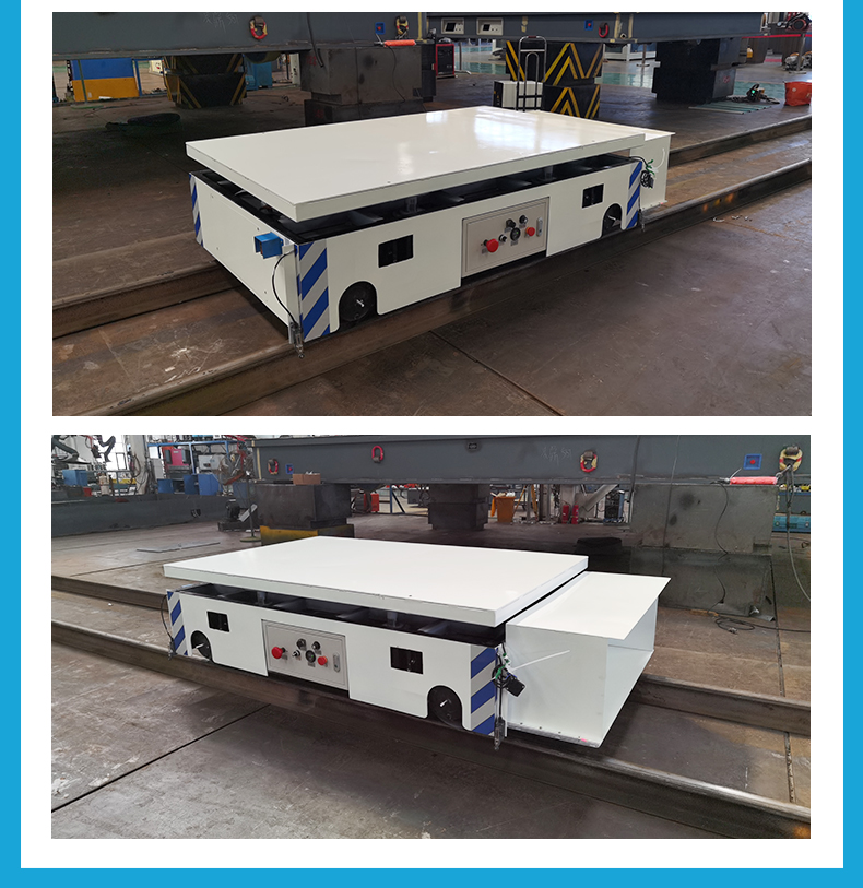 智能升降轨道搬运车,长1.9米宽1.2米高0.48米紧凑车身额定载荷6吨,箱梁结构高强钢焊接承载力强,应对车间各种重型工件、模具的搬运任务。台面内置液压升降模块,可实现80mm行程的整体平稳升降,适用于不同高度生产线、模具安装定位、以及需要精密对位的装配场景,遥控一键升降极大提升灵活性,锂电池组供电配备自动碰撞式充电机具备满电自停功能,无需人工干预解放人力,PLC智控系统,支持编程通过接近开关实现多点位自动停靠,更可连接上位机进行集中控制与调度,轻松融入您的智能工厂管理系统,实现自动化流水线作业!