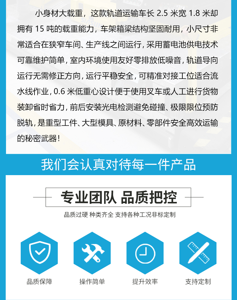 小空间,大承载,专为高效车间打造的电动轨道运输车,2.5米*1.8米紧凑车身15吨额定载荷,轻松穿梭在狭窄通道与生产线间,固定轨道运行平稳**,适用于重型工件、大型模具、原材料、零部件等物料转运,经济高效的解决大重量搬运难题!
