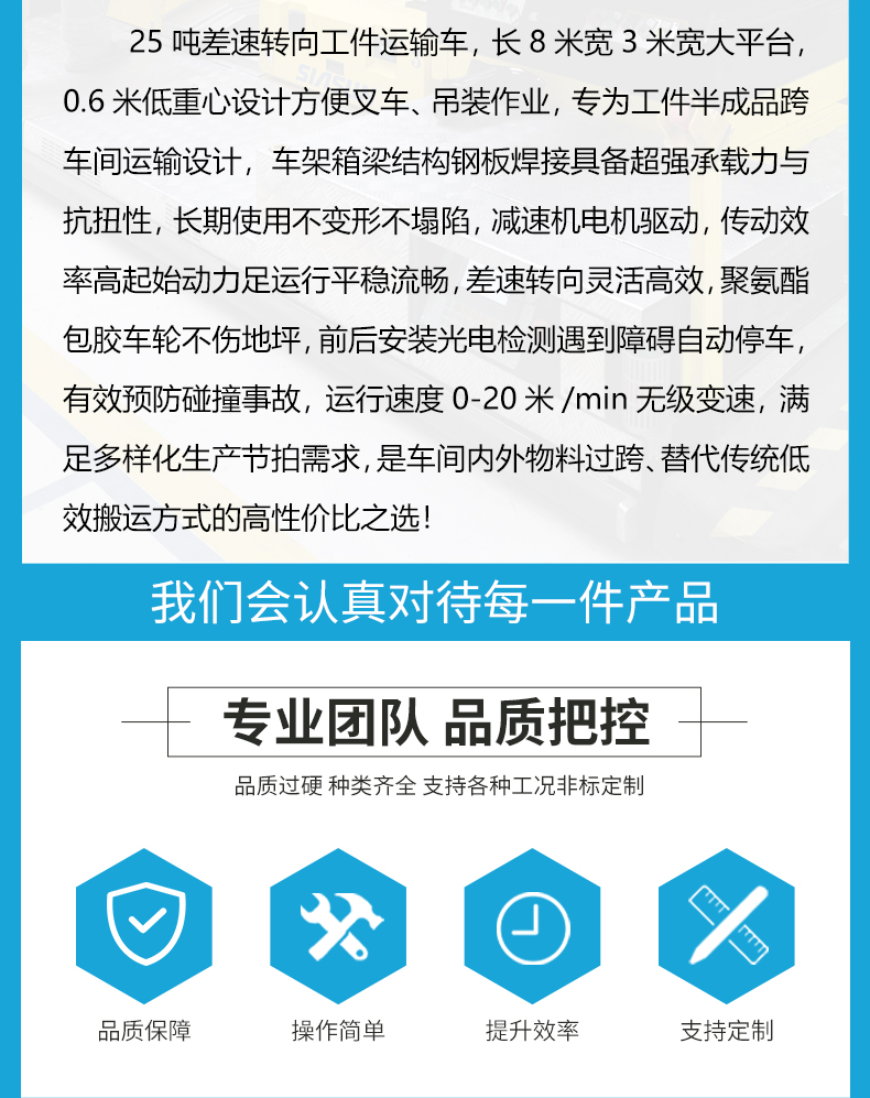 维修简单25吨差速转向工件运输车,长8米宽3米宽大平台,0.6米低**设计方便叉车、吊装作业,专为工件半成品跨车间运输设计,车架箱梁结构钢板焊接具备超强承载力与抗扭性,长期使用不变形不塌陷,减速机电机驱动,传动效率高起始动力足运行平稳流畅,差速转向灵活高效,聚氨酯包胶车轮不伤地坪,前后安装光电检测遇到障碍自动停车,有效预防碰撞事故,运行速度0-20米/min无级变速,满足多样化生产节拍需求,是车间内外物料过跨、替代传统低效搬运方式的高性价比之选!