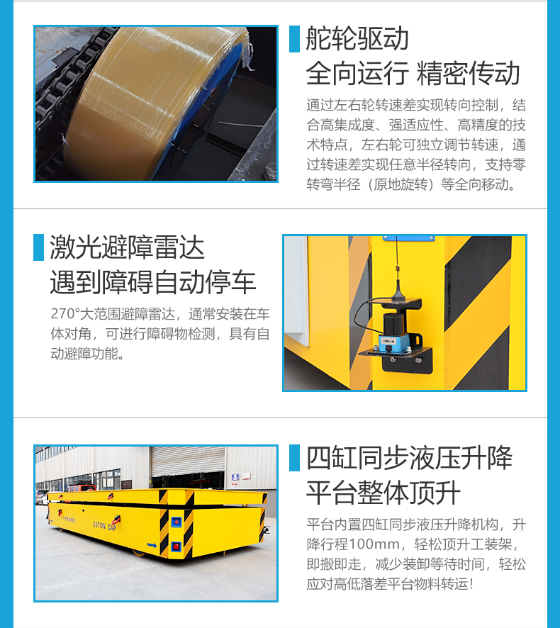 维修简单长5米宽2.2米额定载重35吨,车体内置四缸同步液压升降,100mm升降行程,工装架、重型零件都能扛,顶升工装架超方便,即停即卸,减少大型设备等装卸等待时间,4组差速舵轮是关键,平移、斜行、原地旋转,狭窄车间也能灵活穿梭优化物料转运路径,有效提升整体转运效率,伺服电机+行星减速机,传动高效动力强劲,锂电池供电环保节能全域可用,**装置设有雷达避障遇障即停、使用**省心,重载、灵活、高效还**,工厂转运选它准没错!