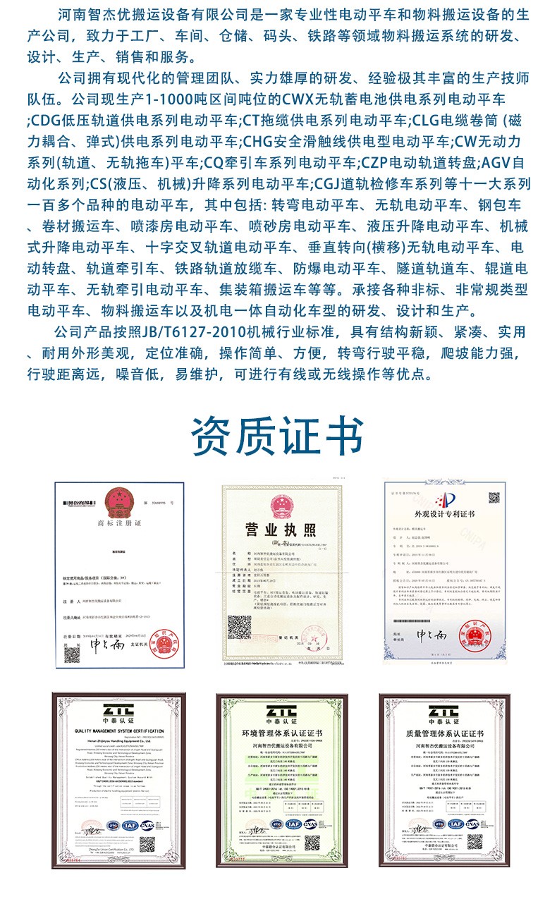 河南智杰优搬运设备有限公司是一家集开发、设计、生产、销售及售后服务为一体的化电动平车生产公司。公司拥有一支现代化的管理团队,凭借科学的管理方法和服务理念,依靠人才、环境支持优势,已成为电动平车行业的企业。致力于工厂、车间、仓储、码头、铁路等领域物料搬 运系统的研发、设计、生产、销售和服务。公司拥有现代化的管理团队、实力雄厚的研发、设计产品技术开发团队与实际工作经验极其 丰富的生产技师队伍。凭借科学的管理方法、雄厚的技术实力,全体员工精诚合作,公司已成为电动平车行业的中坚力量。
