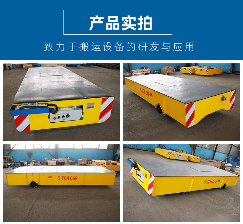 配件的选用均符合防爆相关标准,采用蓄电池作为电源,电机减速机作为驱动系统,实心包胶车轮直接在地面行走的转运车,由手持式操作手柄(线控或遥控)实现平车的启动、停止、前进、后退、左移、右移、转弯等功能。其运行路线不受制约灵活方便,360°原地转弯适应更狭小的空间运行,支持遇人自动停止等功能,保障作业时可靠。