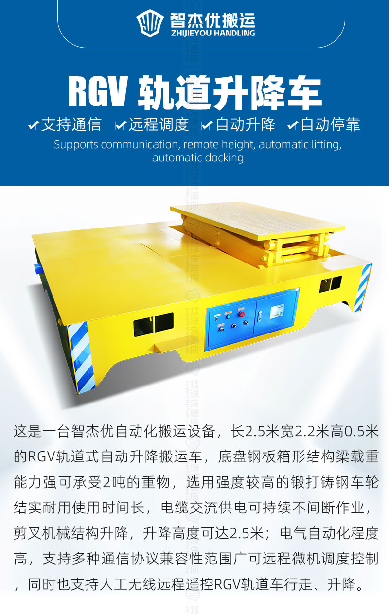 RGV轨道式自动升降搬运车,电气自动化程度高,支持多种通信协议兼容性范围广可远程微机调度控制,同时也支持人工无线远程遥控RGV轨道车行走、升降,作业时防护装置齐全,光电探头实时检测遇到障碍自动停车。
