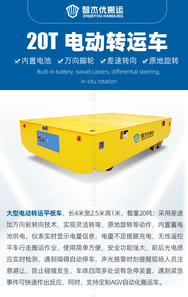 内置蓄电池供电,仪表实时显示电量信息,电量不足提醒充电,无线遥控平车行走搬运作业,使用简单方便,**功能强大,前后光电感应实时检测,遇到障碍自动停车。