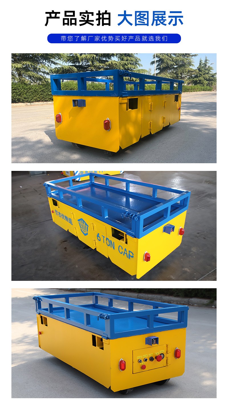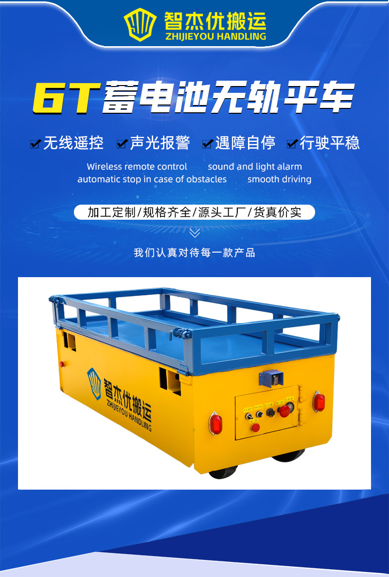 整车长1.7米宽0.8米,高度0.55米,载重6吨,选用舵轮万向轮行走,可前进、后退、原地旋转、左右转弯,人工无线遥控搬运车作业,操作简单方便。