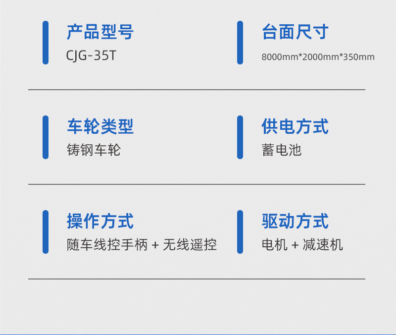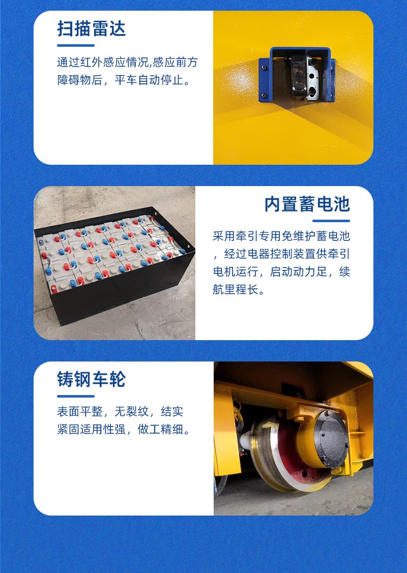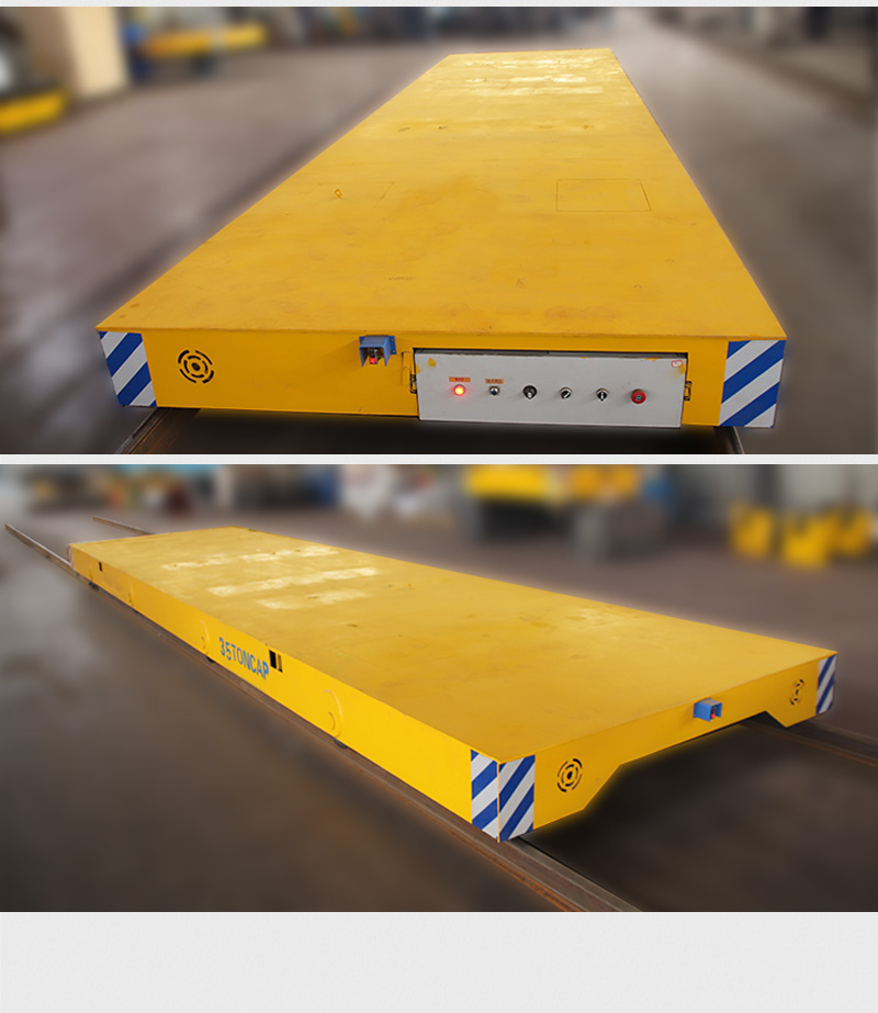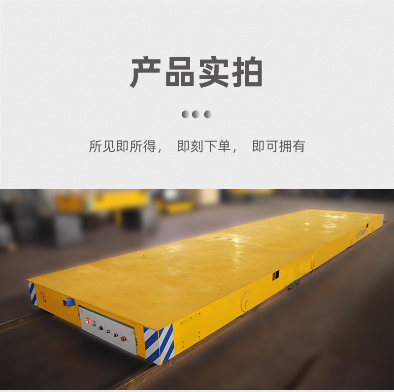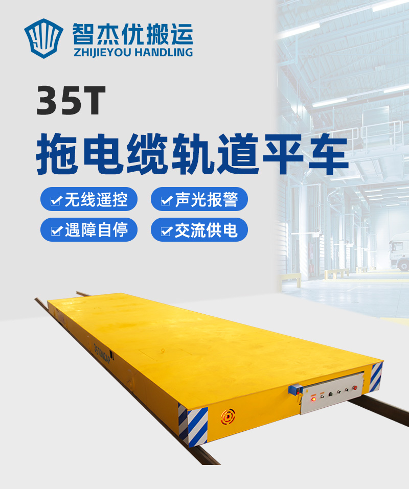 这是一款拖电缆轨道电动平板车,该车长8米、宽2米、高0.35米,采用电缆供电,使用时间不受限制。底盘箱型梁焊接可承重35吨,铸钢车轮结实耐用,平台高度低行走平稳,不易侧翻货物,无线遥控操作简单,速度可人工调节,适合不同场合下使用。声光报警时刻提醒现场人员注意避让,保障作业**。