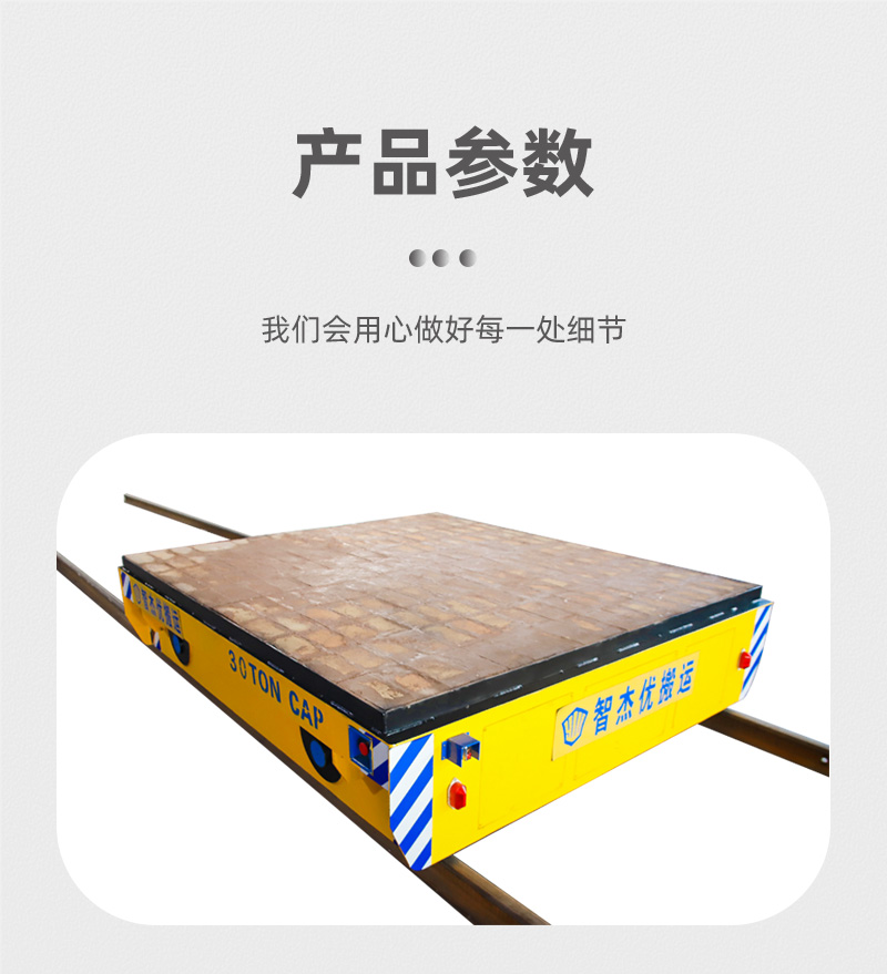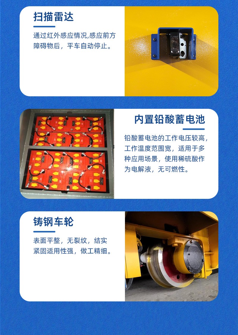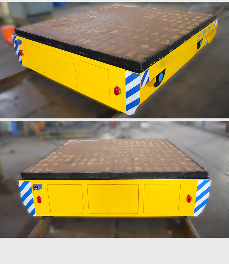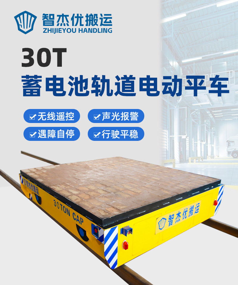 这是一台山东客户定制的蓄电池轨道电动平车,该车长2.5米,宽2.2米,高0.5米,车架箱型梁焊接,结构牢固,载重量大,可载重30吨,应客户使用要求,台面铺设耐火砖;平车采用蓄电池供电,运行距离不受限制,遥控器一键操作,可启动停止、前进后退、调速等,设有双限位开关,可根据现场设定地点自动停靠,前后光电检测,遇障自停,声光报警保障**,能够在垂直轨道、L型轨道、S型轨道、弧形轨道及易爆、摆渡场合使用。