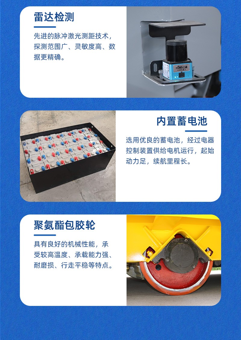 AGV自动化无轨电动平车 采用二维码导航系统,车身底部装有摄像头,通过扫描二维码设定好的路线进行货物的搬运,实现多点位的自动停靠。该车载重5吨,满载状态下,AGV小车运行自如,启停平稳无冲击,前进后退、原地旋转无压力,点位自动停靠精准无误,AGV的导航方式灵活多样,还可采用磁条/激光/GPS/红外射线/视觉引导等多种导航方式。