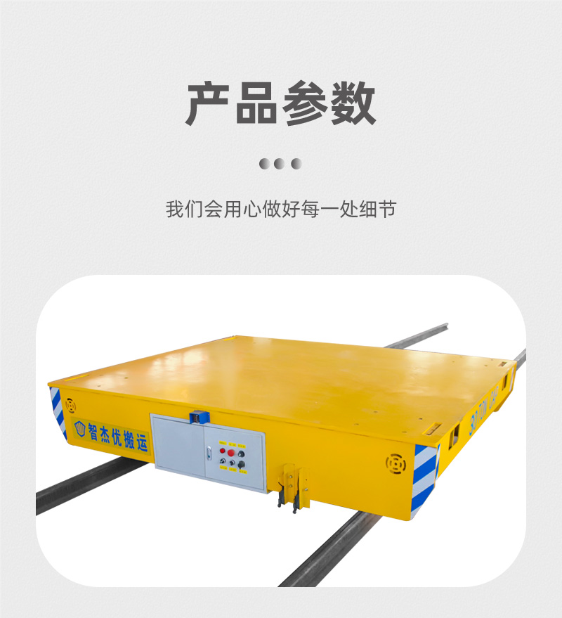 拖电缆电动轨道平板车,电缆供电作业时间不受限制,铸钢车轮结实寿命长,平台高度低行走平稳,不易侧翻货物,低速大功率运行,启动平稳驱动力大,适用于各种工况。设有双组限位传感器,可根据现场设定地点自动停靠,同时可定制升降,称重、远程调度、车载机械、异形卡槽、滚轮台面、超低台面等功能。
