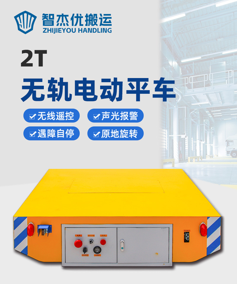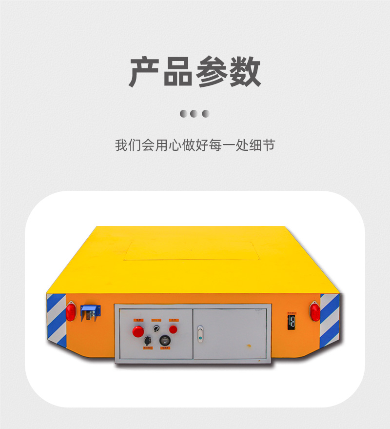 无轨电动平车,车身长1.5米。宽1.5米,高0.5米,箱梁结构焊接,结构稳定,蓄电池供电,运行路线不受限制。无线遥控小车,可前进后退左右转弯,原地旋转,采用卧式驱动轮和万向轮,转向灵活,电磁制动。断电自动刹车,车身对角设有急停按钮、声光报警、保障**,激光雷达遇障自停。