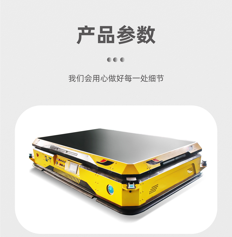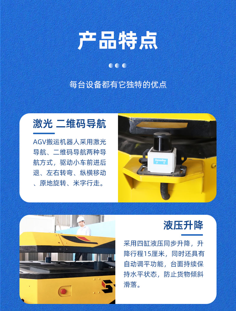 这是一台AGV自动化搬运机器人,整车长3米宽2米高0.6米,载重5吨,框架结构钣金造型,外形美观大方。AGV搬运机器人采用激光导航及二维码两种导航方式,设有无线AP模块,上位机控制小车前进、后退、左右转向,纵横移动,原地旋转,米字行走。对角安装2组重载舵轮,2组双回旋万向轮,小车搭载液压装置,平台可上下升降,行程15厘米,同时还具有自动调平功能,预防货物倾斜滑落,装有导航雷达、激光雷达,循迹行走自动避障,同时设有声光报警、智能语音播报,提醒人员注意避让。