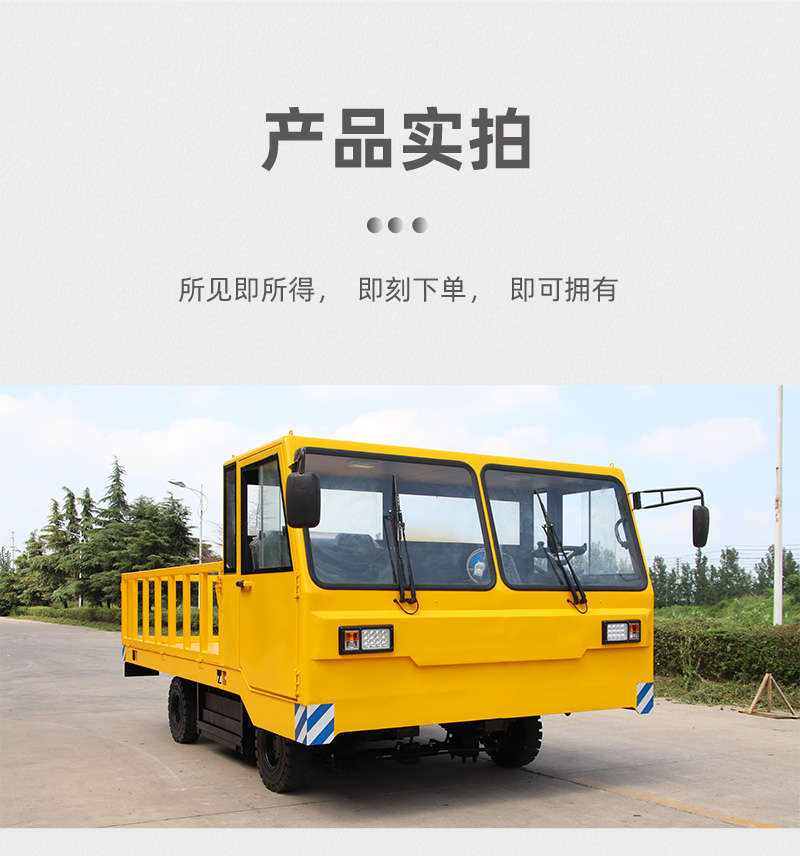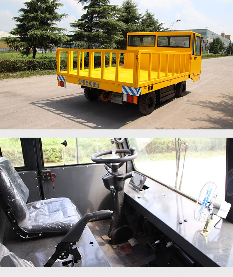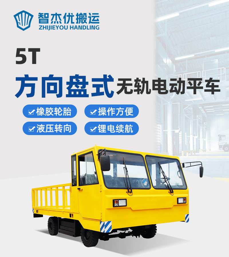 方向盘式无轨电动平车,整车长4.2米宽2.4米高0.8米载重5吨,后面车厢长3米宽2.3米四周设有护栏,驾驶室方向盘控制车辆前进后退、左右转弯加减速,双人座位可同时多人协同进行搬运作业,锂电池供电续航里程长,4个实心橡胶轮胎防滑耐磨耐刺穿承载能力强,液压转向电子转弯助力,轻便灵活转向动力充沛,液压助力油刹制动响应灵敏惯性小,倒车影像,照明灯、转向灯、示廓灯配备齐全,同时平车具备欠压、过压、过流等防护。重型物料轻松搬运!