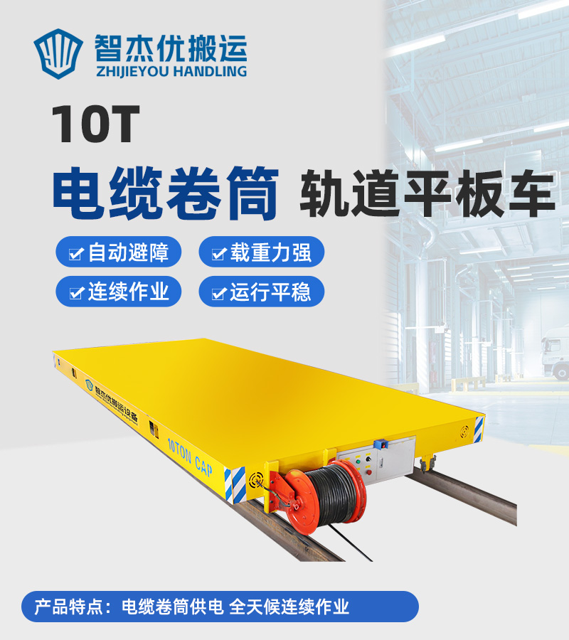 电缆卷筒轨道电动平车,整车长6米宽2.5米高0.5米,车架箱梁结构承重力强可搬运10吨的货物,380V电缆供电,设有卷筒装置自动收放电缆线,可满足全天候的作业需求,平车运行距离20米,运行速度0-20m/min,支持变频调速,无线遥控和有线手柄两种操控方式,操作简单方便快捷,是车间短距离物料转运的专业选手。