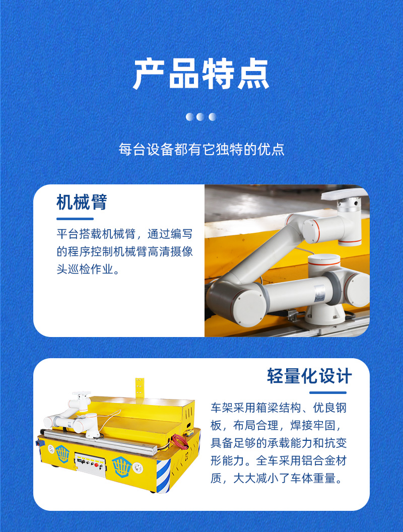 轨道巡检车出厂前调试实拍,台面尺寸长1米宽1.6米高0.4米,整车采用铝合金材质,轻量化设计,客户用于地铁轨道的探伤作业,蓄电池供电配有自动充电机充满自动断电,运行速度0-30m/min,无级变速控制器速度可调节,平台搭载机械臂高清摄像头,自动化智能化无接触检测,对轨道的几何状态、不平顺状况、轨距、道床的稳定性以及轨道上的障碍物等,通过实时监测这些参数,及时发现潜在的**隐患,为铁路维护提供数据支持。