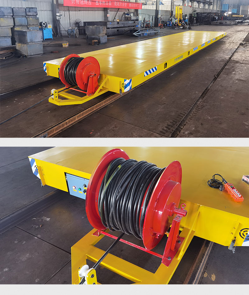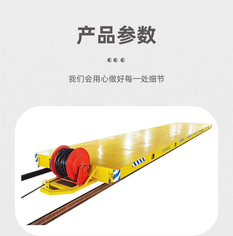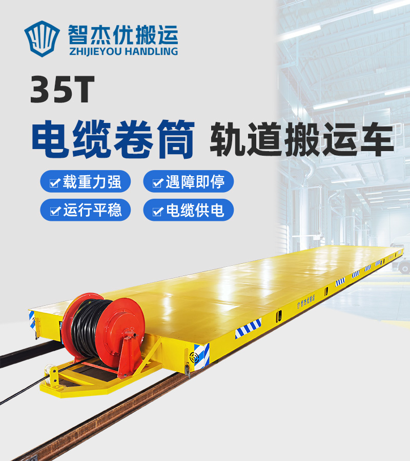 智杰优搬运研发制造的重载轨道搬运车,长12米宽2.4米高0.35米额定载重35吨,主要用于机电设备的运输过跨,采用电缆卷筒供电方式,卷筒自动收放电缆线不易损伤电缆,增加使用寿命,并且适用于远距离的频繁搬运需求,无线遥控操作平车前进后退、运行速度0-20m/min速度可调节,超低台面方便设备的装卸,**装置设有光电检测,遇到障碍自动停车,声光报警、急停开关,**性高,电缆卷筒轨道搬运车的运用,解决了企业重型设备过跨难的问题,同时提高生产装配效率,减少人工劳动降本增效!